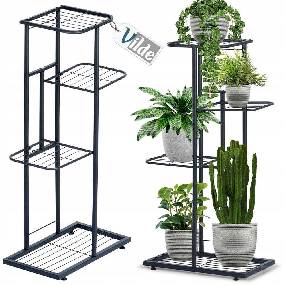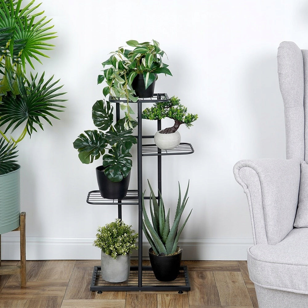 Stilingas ir praktiškas keturių pakopų metalinis gėlių stovas, sukurtas patogiam augalų ar dekoracijų laikymui įvairiuose aukščiuose. Elegantiško pramoninio stiliaus, šis juodos matinės spalvos stovas suteiks jūsų interjerui modernumo ir taps išskirtine puošmena.