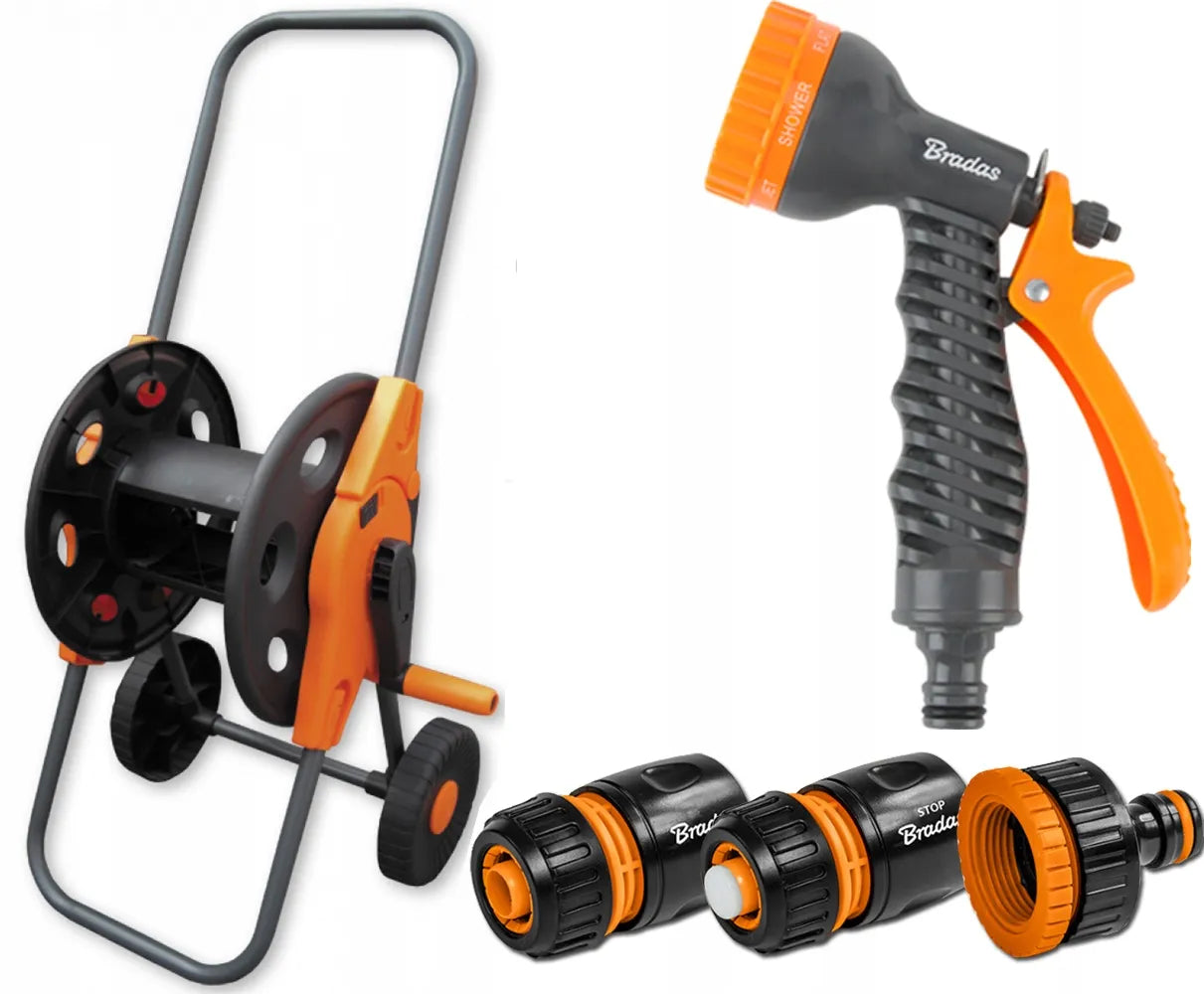GUMINĖ SODO ŽARNA 3/4" 30m 4 SLUOKSNIŲ PREMIUM PISTOLETAS VEŽIMĖLIS RINKINYS BRADAS
