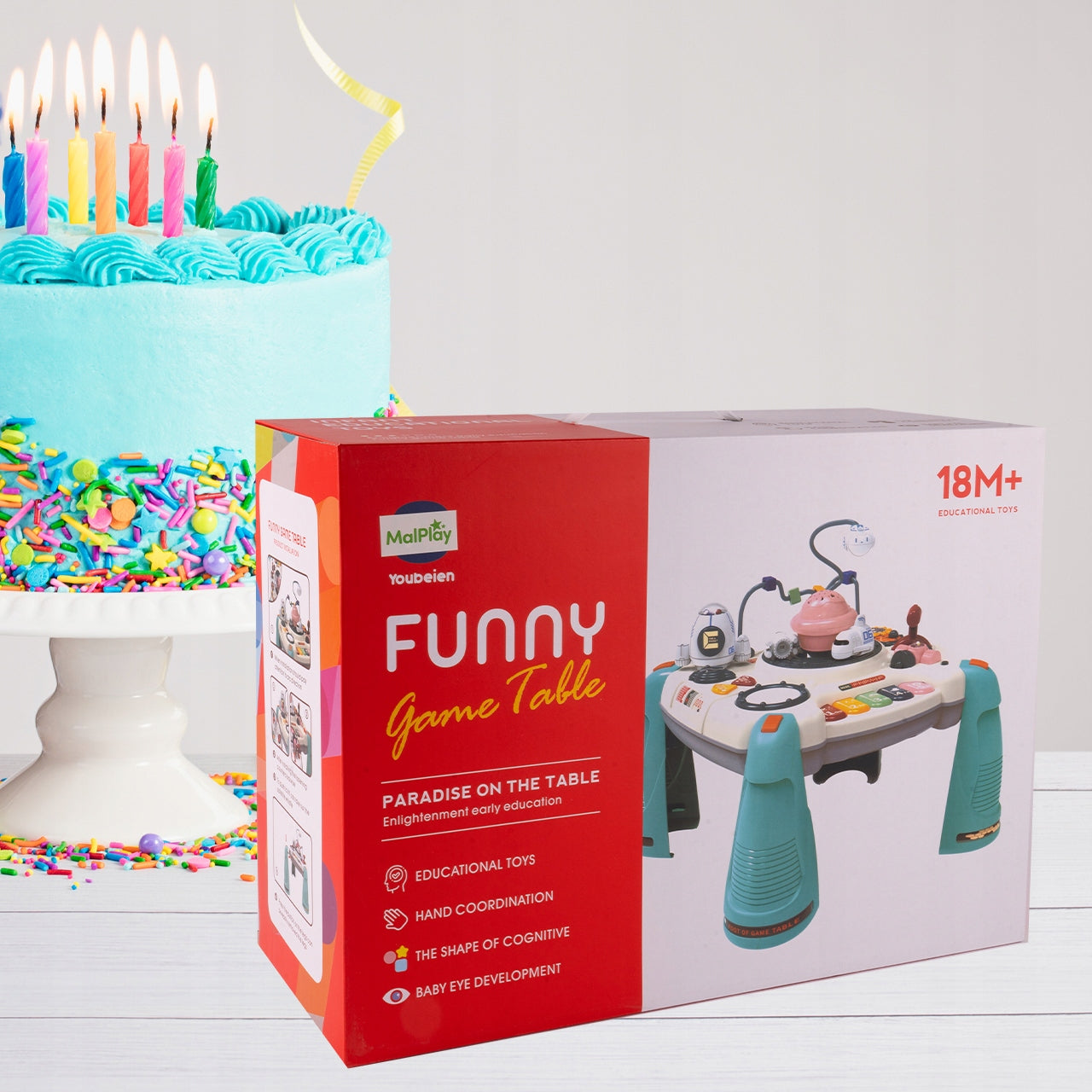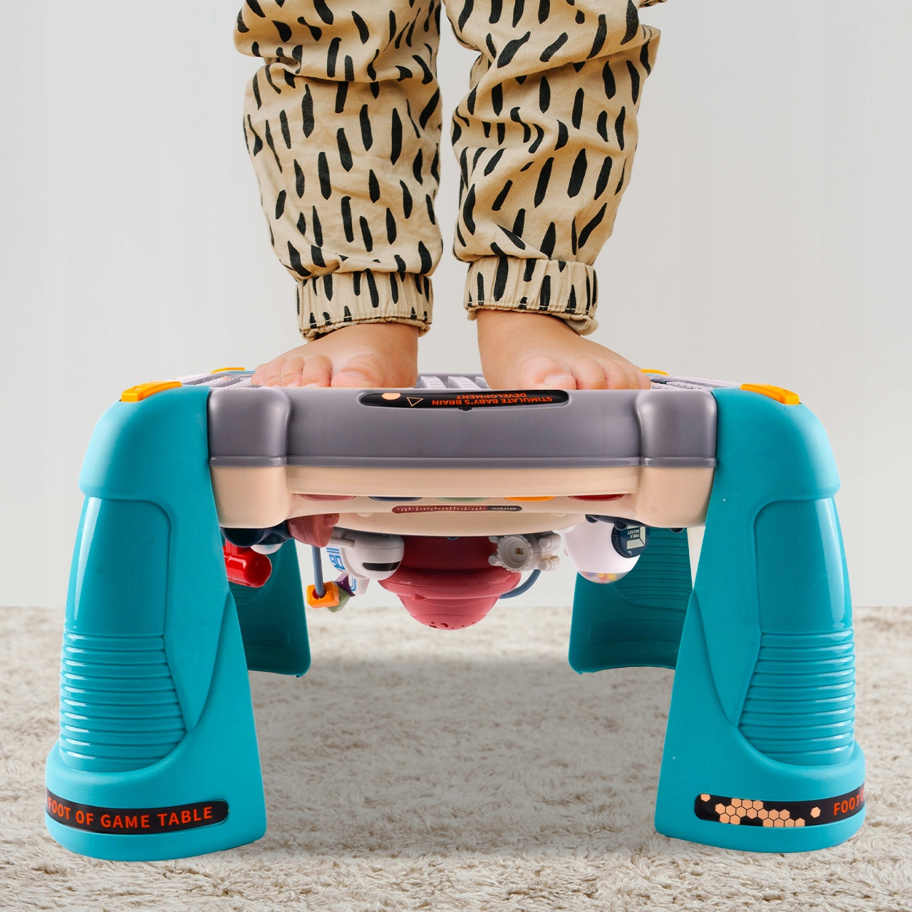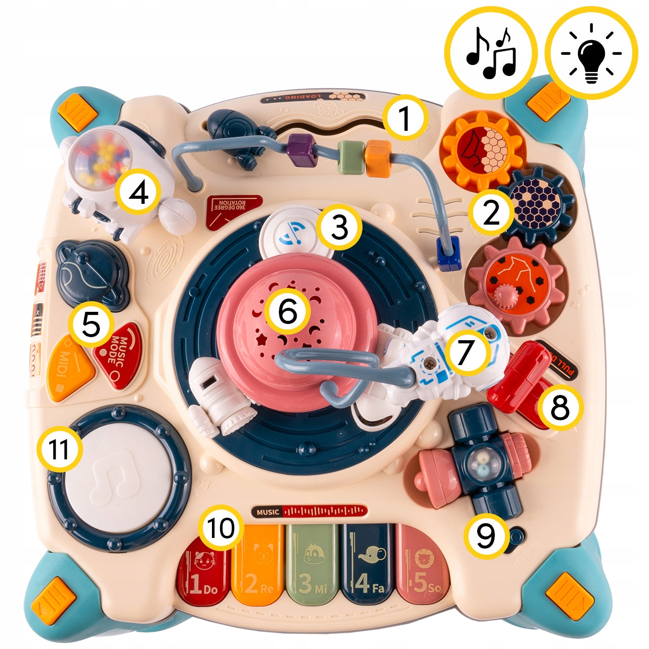 Muzikinis pianino modulis siūlo daugybę funkcijų: nuo atskirų garsų grojimo iki visų melodijų paleidimo. Vaikai galės eksperimentuoti su garsais, kurti savo muzikines kompozicijas arba tiesiog mėgautis linksmais kūrinėliais, skambančiais anglų kalba. Be pianino, staliuke yra mygtukai, jungtukai ir kiti elementai, kurie stimuliuoja vaiko pojūčius ir padeda suprasti priežasties ir pasekmės ryšius. Žaislas puikiai tinka vystyti vaiko pažintinius gebėjimus ir sensoriką.
