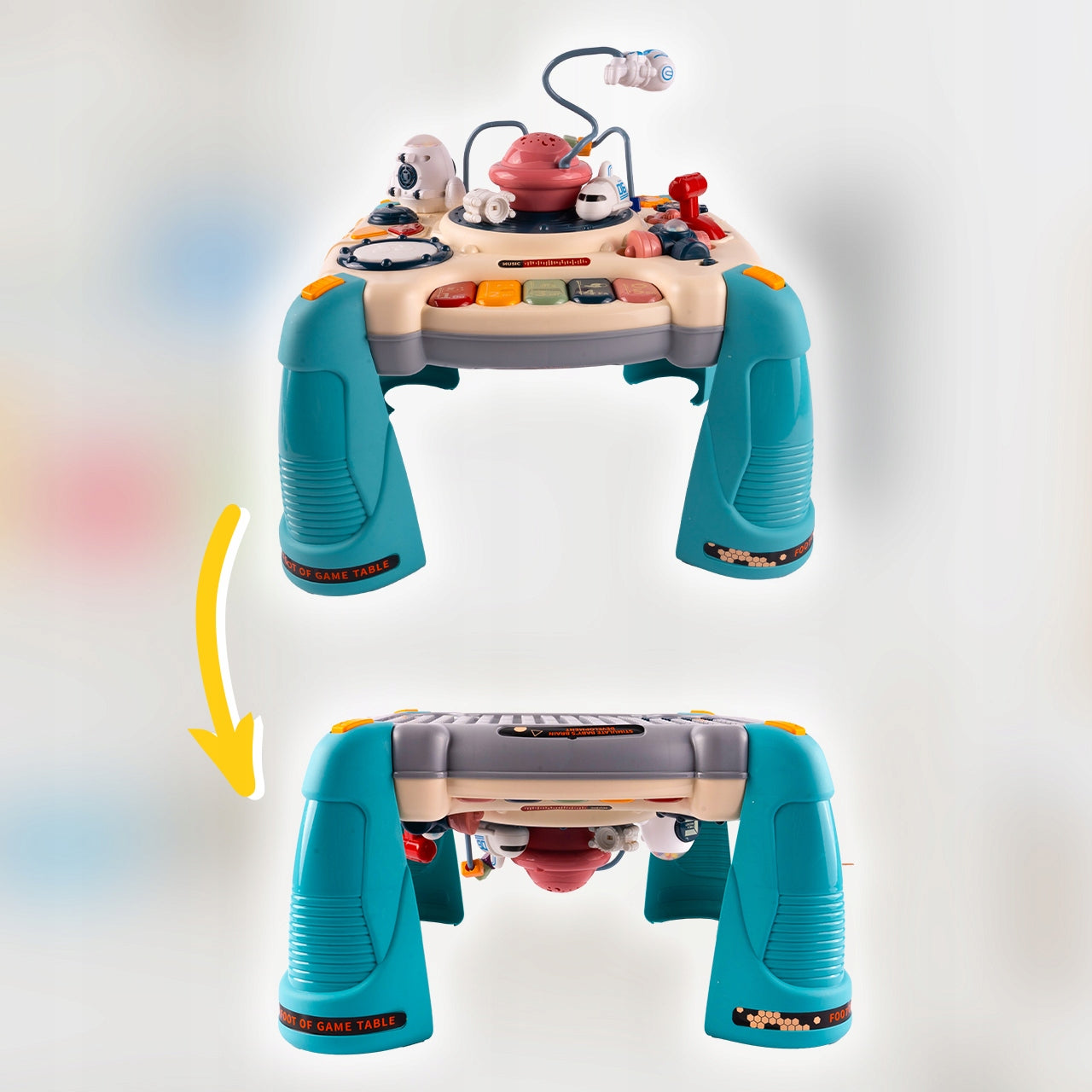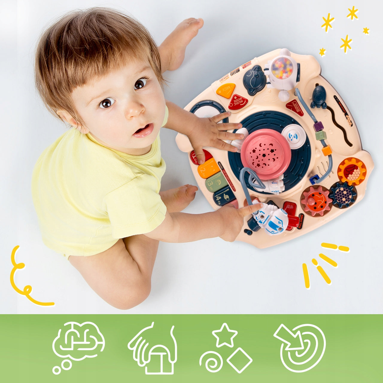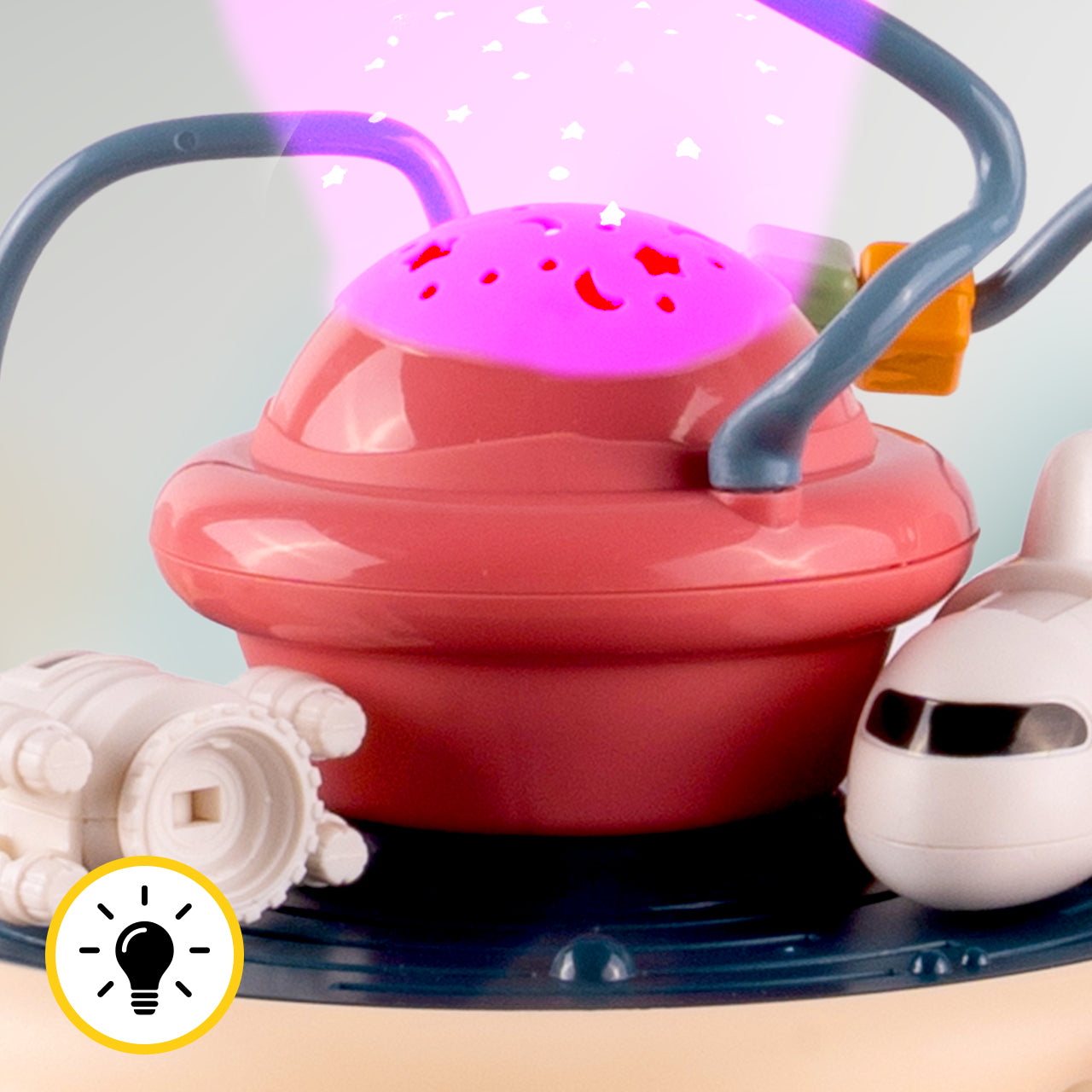 Šis staliukas – tai ne tik žaislas, bet ir mini kosmoso centras! Centre įrengta besisukanti kosmoso stotis, kurią supa projekciniai žvaigždžių raštai, kartu su žaisminga muzika sukurianti svajonių pasaulį. Vaikai galės žaisti su dviem nuimamais kosminiais laivais, tyrinėti sukamas pavaras ir kitus judančius elementus, kurie lavina rankelių koordinaciją ir loginį mąstymą. Visi elementai sukurti taip, kad būtų lengvai pasiekiami ir patrauklūs mažyliams, skatinant savarankišką žaidimą ir mokymąsi.