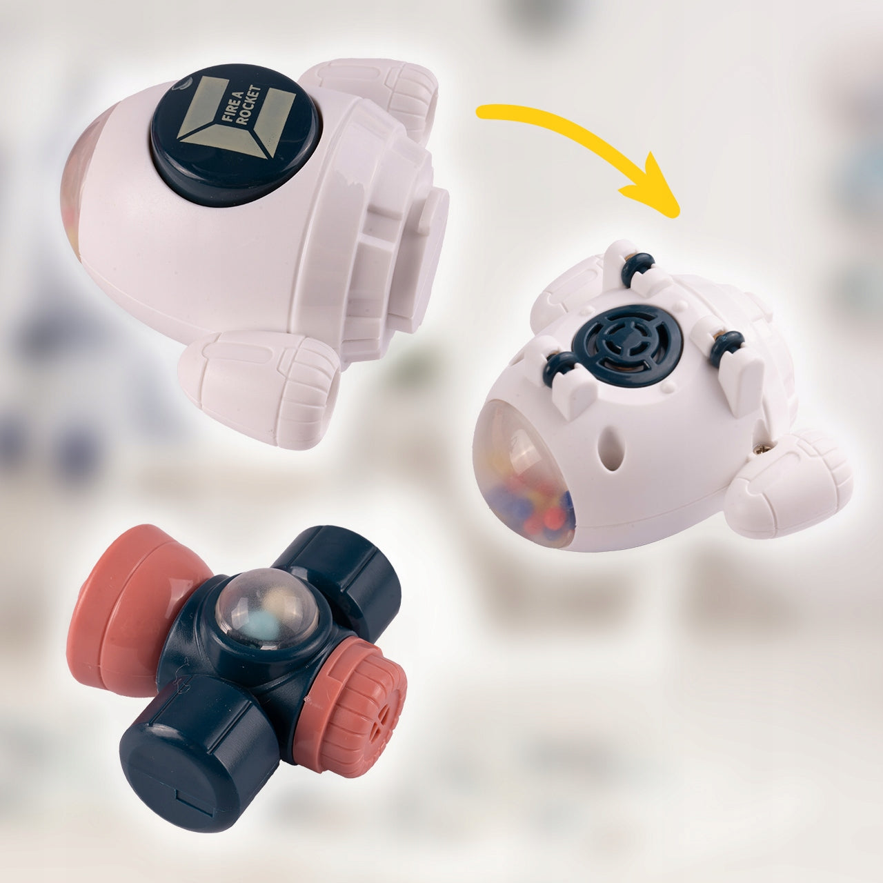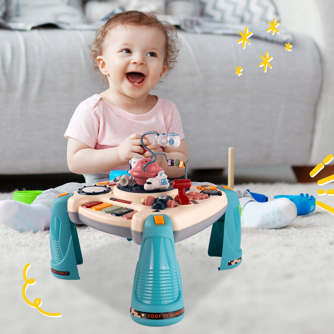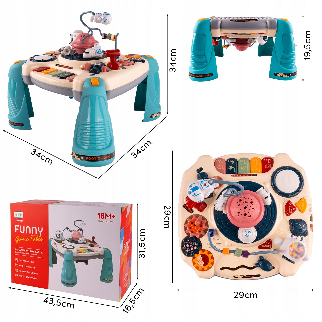 Šis staliukas – tai ne tik žaislas, bet ir mini kosmoso centras! Centre įrengta besisukanti kosmoso stotis, kurią supa projekciniai žvaigždžių raštai, kartu su žaisminga muzika sukurianti svajonių pasaulį. Vaikai galės žaisti su dviem nuimamais kosminiais laivais, tyrinėti sukamas pavaras ir kitus judančius elementus, kurie lavina rankelių koordinaciją ir loginį mąstymą. Visi elementai sukurti taip, kad būtų lengvai pasiekiami ir patrauklūs mažyliams, skatinant savarankišką žaidimą ir mokymąsi.