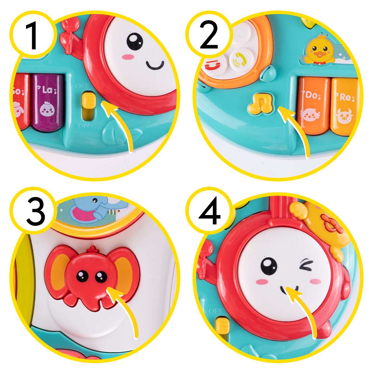 - Įmontuoti žaislo priedai: mini pianinas, besisukantys elementai, žaislinis telefonas.