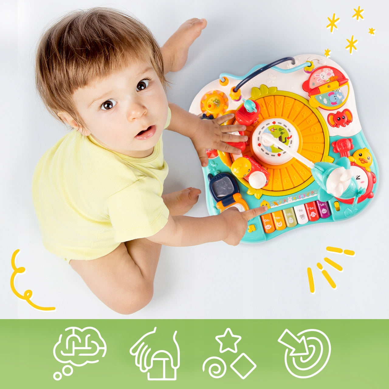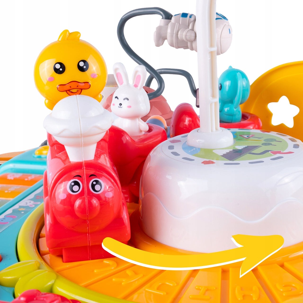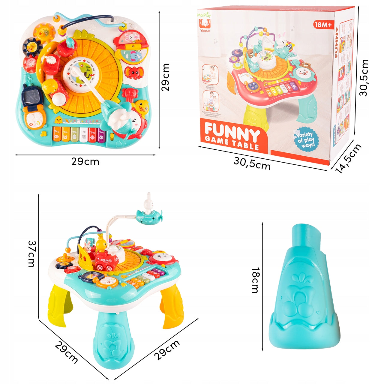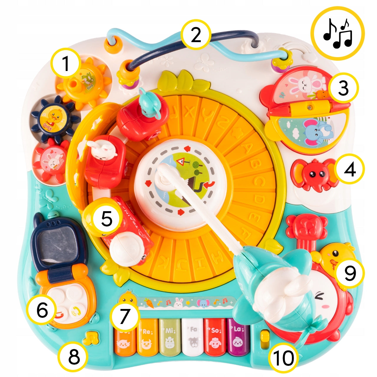 Šis žavingas edukacinis stalelis yra sukurtas tam, kad jūsų vaikas galėtų smagiai ir produktyviai leisti laiką. Jame gausu įvairiausių interaktyvių elementų, skatinančių mažylio smalsumą ir lavinančių jo gebėjimus. Nuo spalvingų klavišų, skleidžiančių linksmus garsus ir melodijas, iki besisukančių ratukų bei šviečiančių mygtukų – kiekvienas elementas yra apgalvotas, siekiant maksimalaus vaiko užimtumo ir lavinimo. Tai puiki priemonė pažinti spalvas, formas ir garsus.