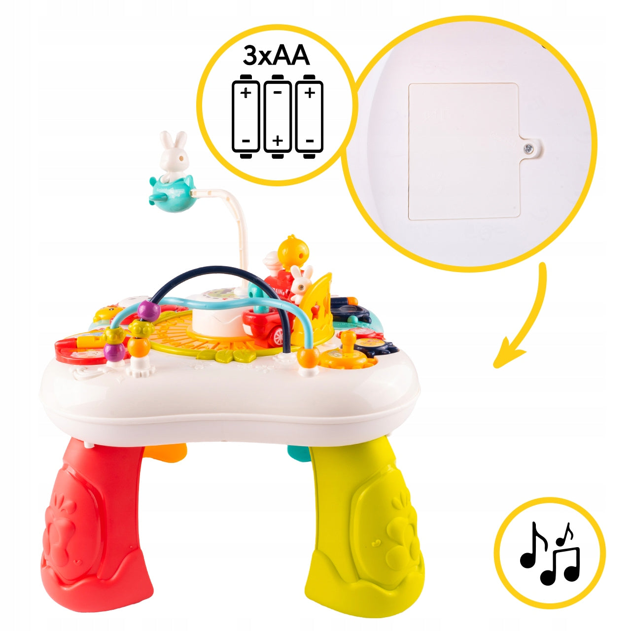 Stalelyje integruotas mini pianinas, kuris ne tik džiugina vaikus melodijomis, bet ir padeda lavinti muzikinį klausą bei pažinti natas. Imituojamas telefonas su mygtukais suteikia galimybę vaidinti ir lavinti smulkiąją motoriką. Žaisdami su šiuo staleliu, vaikai lavina koordinaciją, mąstymą ir suvokimą apie priežasties ir pasekmės ryšį, ypač tyrinėdami judančią zuikio figūrėlę bei sukamas dantratukų sistemas. Ryškios spalvos ir šviesos efektai stimuliuoja vaiko pojūčius.