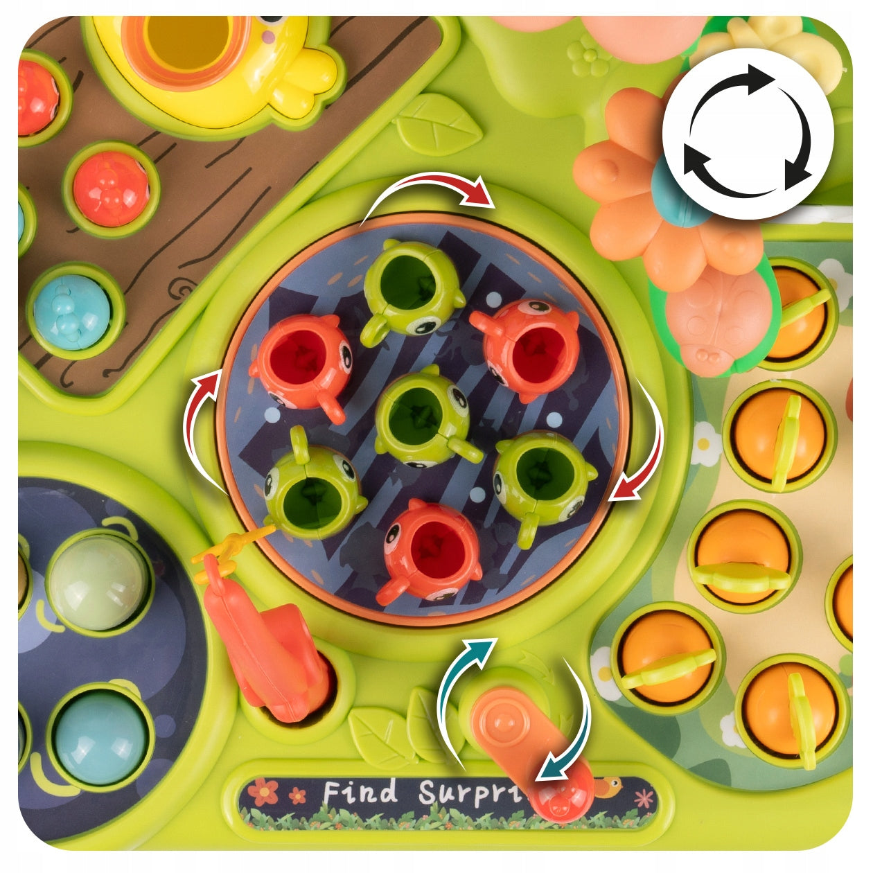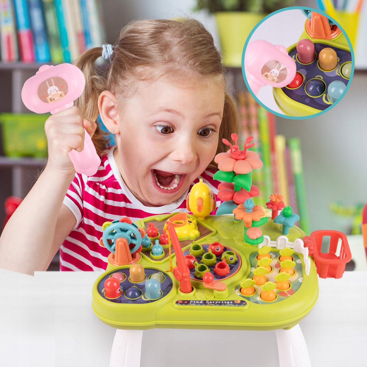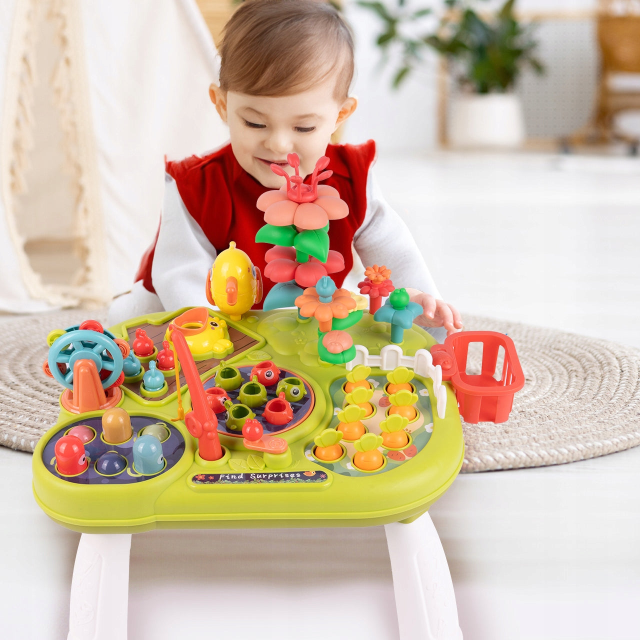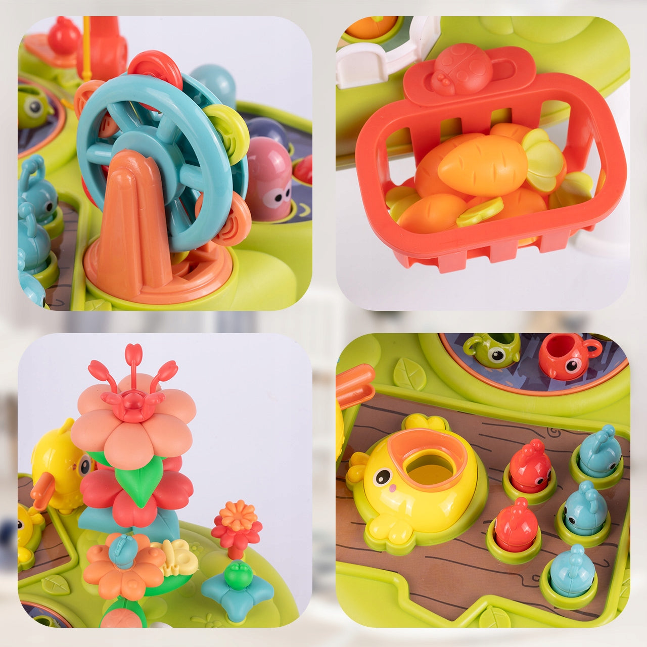 Šis lavinamasis staliukas yra tikras smegenų ir judesių ugdymo centras. Vaikai gali lavinti pirštukų miklumą, stumdami, spausdami ir sukdami įvairius elementus. Žvejojimo žaidimas su meškere ir spalvingomis žuvelėmis stiprina rankos ir akies koordinaciją bei tikslumą. Įmušimas varžtais ir kūju skatina rankos jėgą ir koordinaciją. Daržininkystės modulis, kuriame galima sodinti ir skinti morkas bei gėles, ne tik lavina vaizduotę, bet ir supažindina su gamta bei augalais. Visi šie elementai kartu su garso efektais ir judančiomis dalimis užtikrina daugiaplanį vaiko ugdymą, paruošiant jį naujiems atradimams.