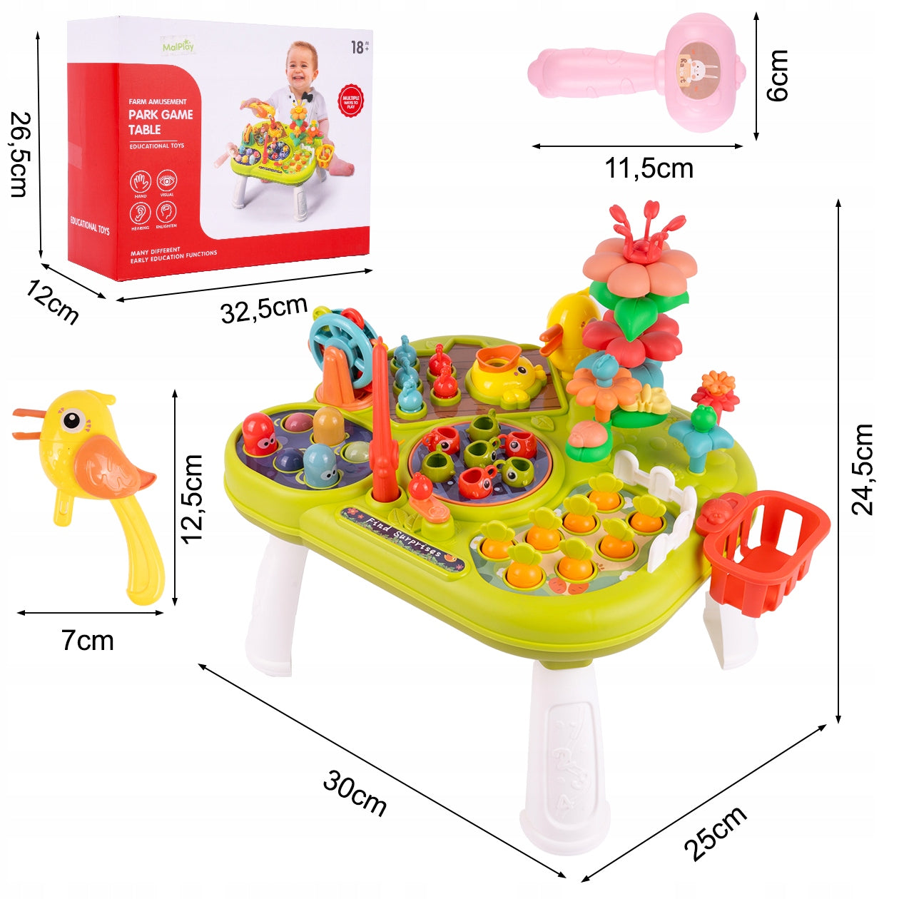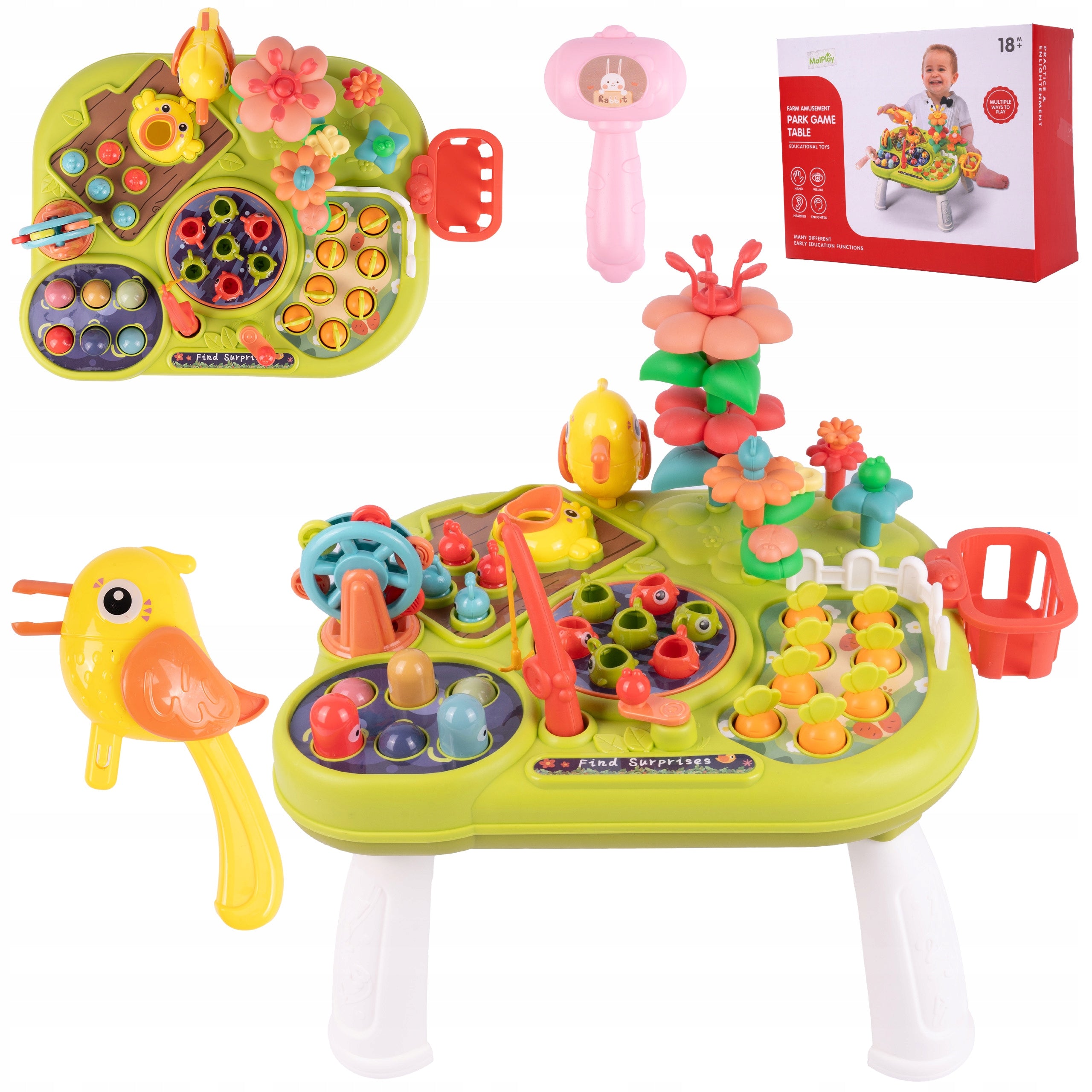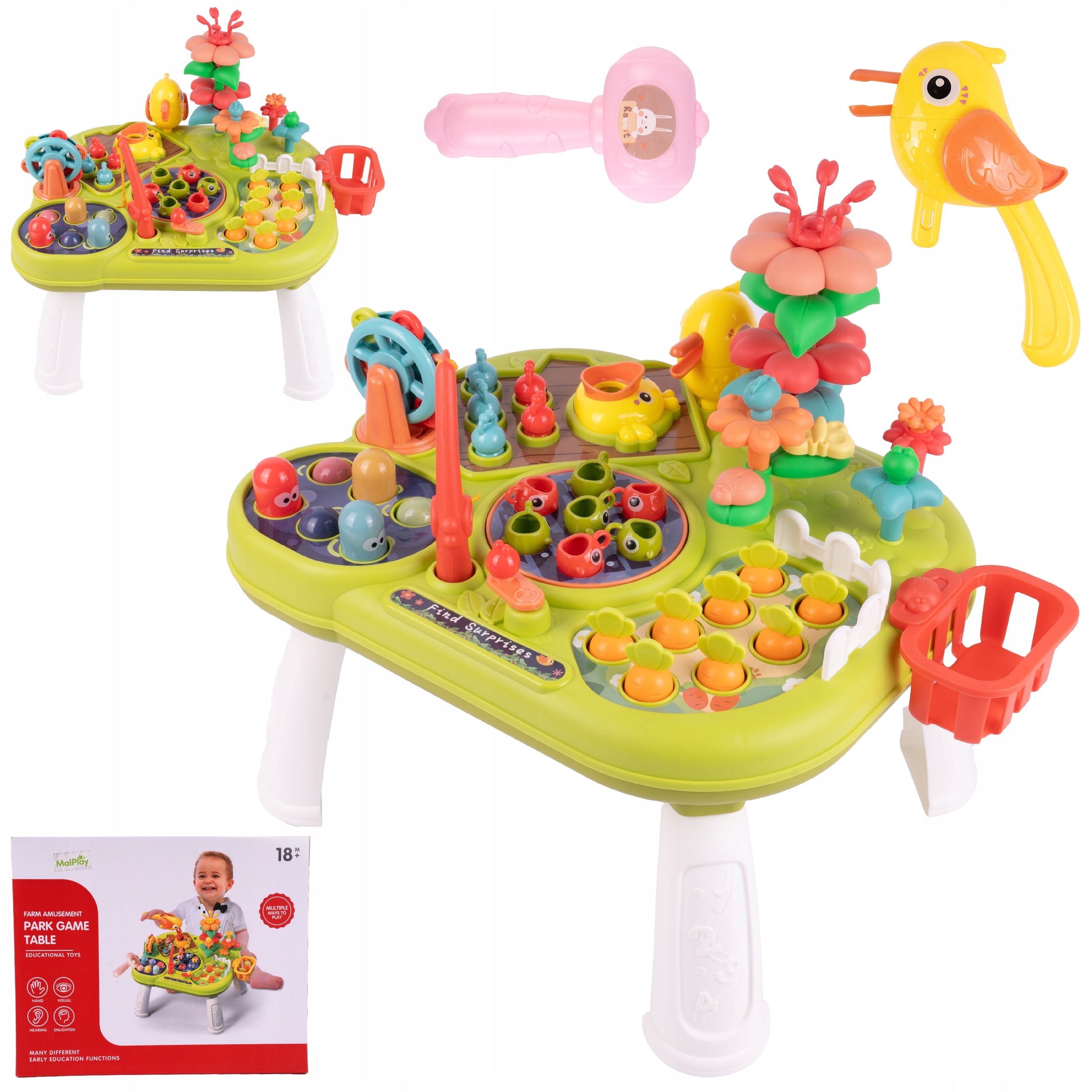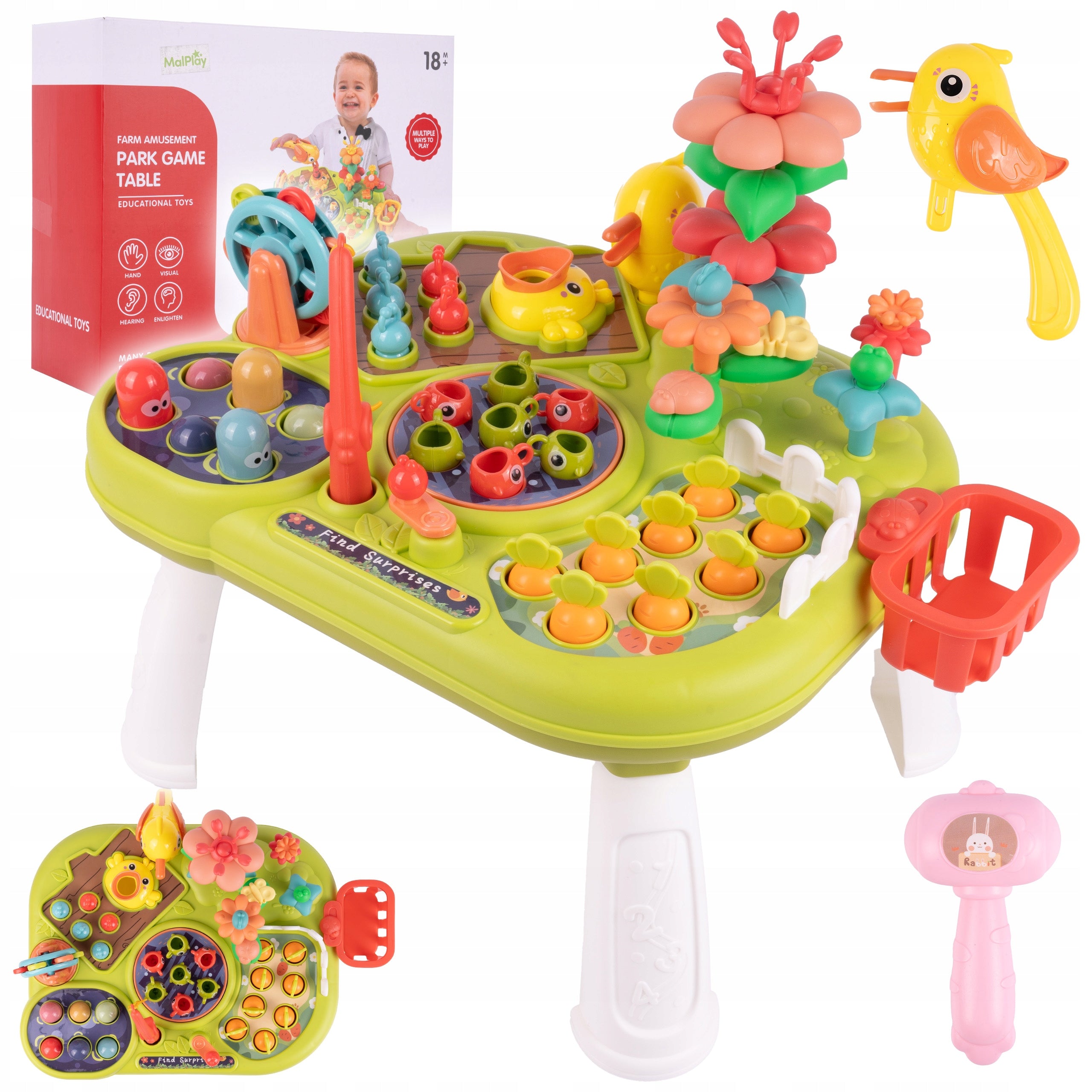 Šis daugiafunkcinis staliukas siūlo daugybę žaidimo galimybių, kurios ilgam užims jūsų vaiką. Žaidimas su meškere moko kantrybės ir tikslumo gaudant žuvis. Kalant „kirmėles“ kūju, lavinama rankos jėga ir gebėjimas taikytis. Darželis su morkomis ir gėlėmis skatina vaizduotę ir domėjimąsi gamta. Net ir „maitinimo“ žaidimas su kirmėle reikalauja kantrybės ir vikrumo. Visos šios veiklos padeda vaikui ramiai mokytis, ugdyti kantrybę ir gerinti smulkiąją motoriką.
