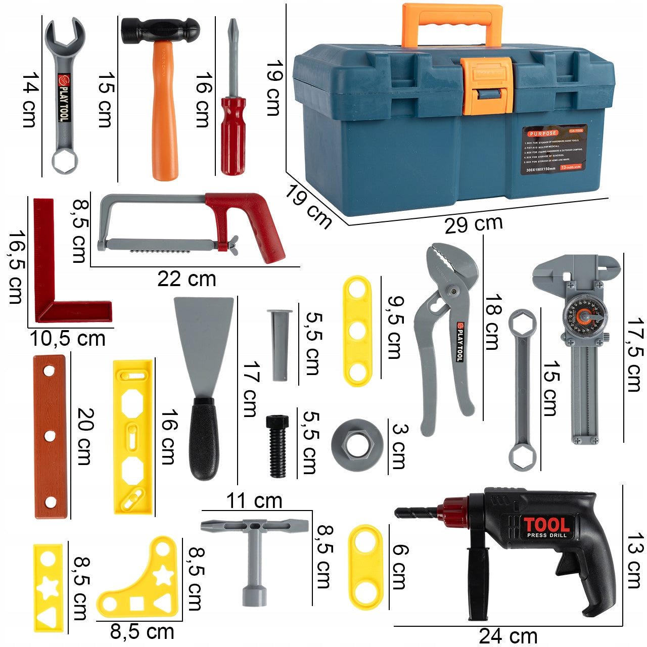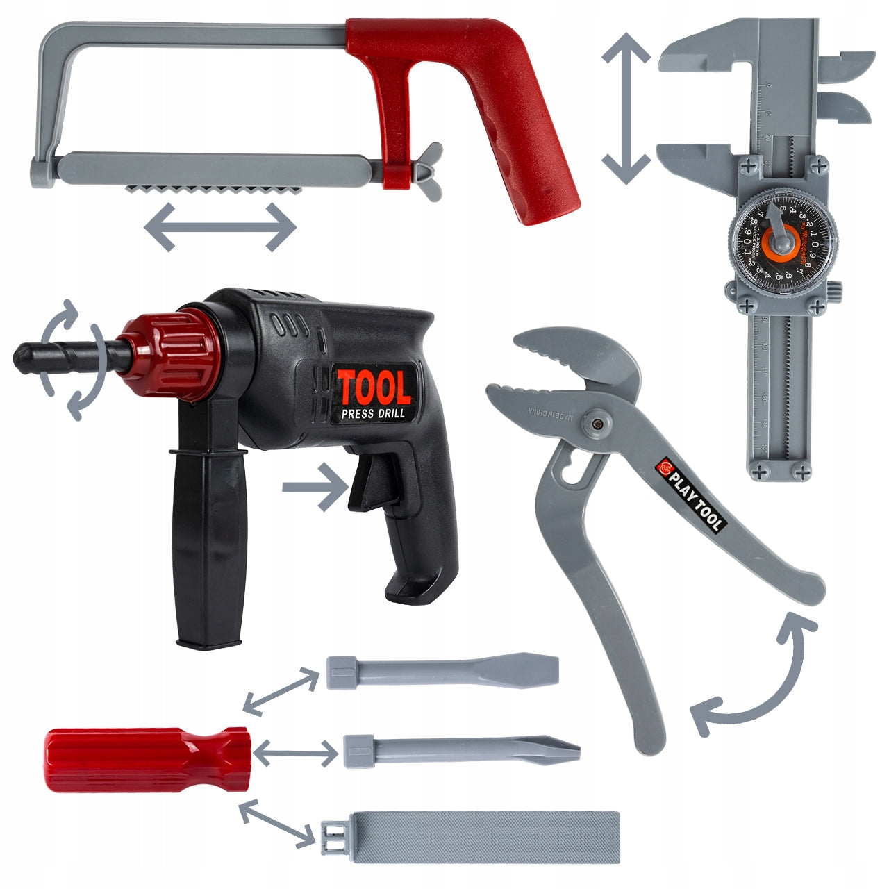 - Realistiškas dizainas: Įrankiai atrodo kaip tikri, suteikdami vaikui autentiškumo jausmą žaidžiant.