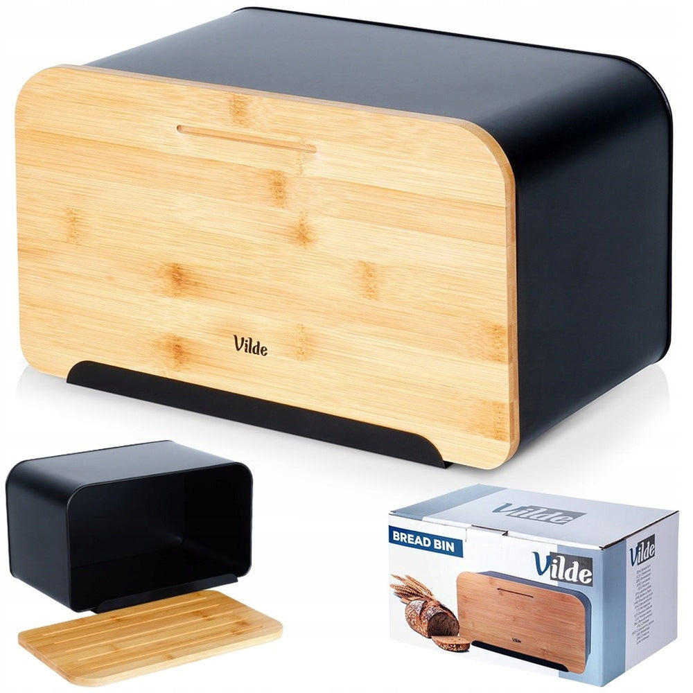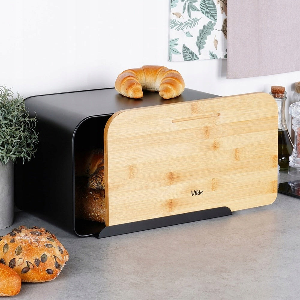 Juoda metalinė medinė duoninė, uždaromas indas duonai ir bandelėms