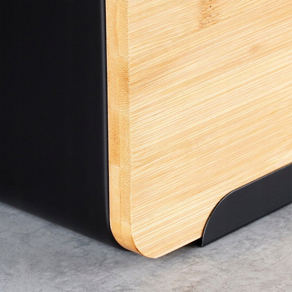 Šis duonriekis yra puikus modernaus dizaino ir natūralių medžiagų derinys. Matinė juoda metalinė apdaila suteikia jam elegancijos ir minimalistinio stiliaus, o šiltas bambuko medienos atspalvis prideda jaukumo. Toks dizainas leidžia jam lengvai įsilieti į bet kokio stiliaus virtuvės interjerą – nuo modernaus iki klasikinio ar skandinaviško. Bambuko mediena yra ne tik estetiška, bet ir ekologiška, todėl pasirinkdami šį duonriekį, prisidedate prie tvaresnio vartojimo. Siekiant išsaugoti bambuko dangčio kokybę ir ilgaamžiškumą, rekomenduojama jį retkarčiais patepti maistiniu aliejumi ir vengti plovimo indaplovėje.