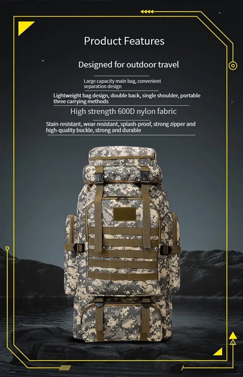 Ši 80 litrų talpos kareiviška kamufliažinė kuprinė yra puikus pasirinkimas tiems, kurie vertina patvarumą ir funkcionalumą ekstremaliomis sąlygomis. Įkvėpta kariuomenės, ši kuprinė idealiai tinka ilgesnėms kelionėms, žygiams ir išgyvenimo ekspedicijoms.