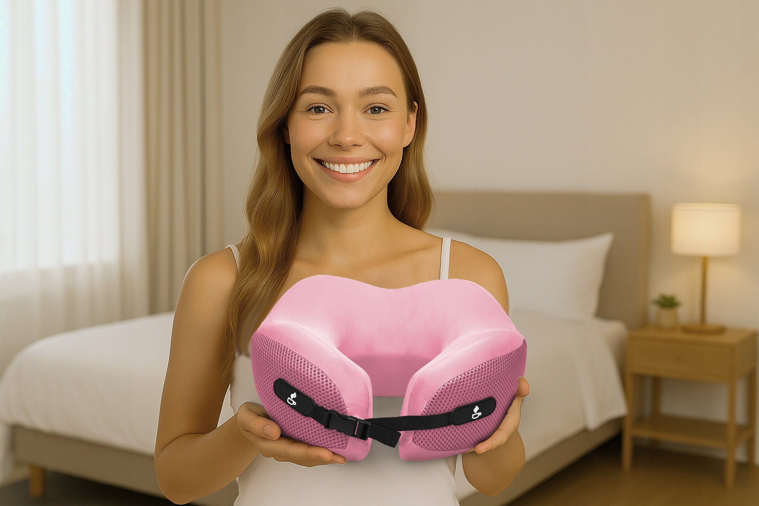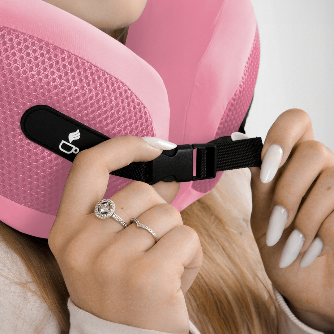 - Reguliuojamas prigludimas: Tvirtas sagties užsegimas leidžia pritaikyti pagalvę bet kokiam kaklo dydžiui.