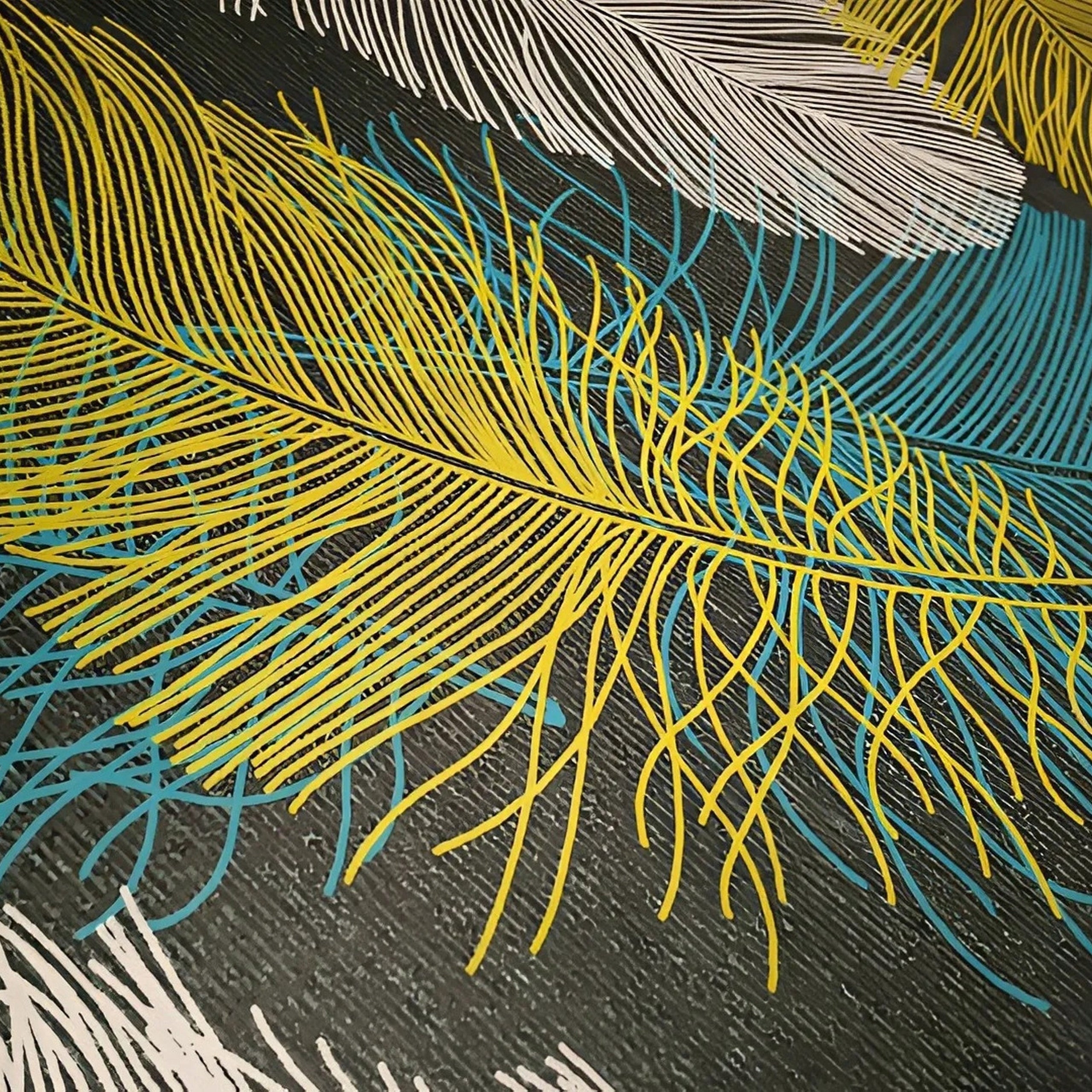 - Elegantiškas ir modernus dizainas su juodos, mėlynos ir geltonos spalvų bei plunksnų motyvo deriniu.