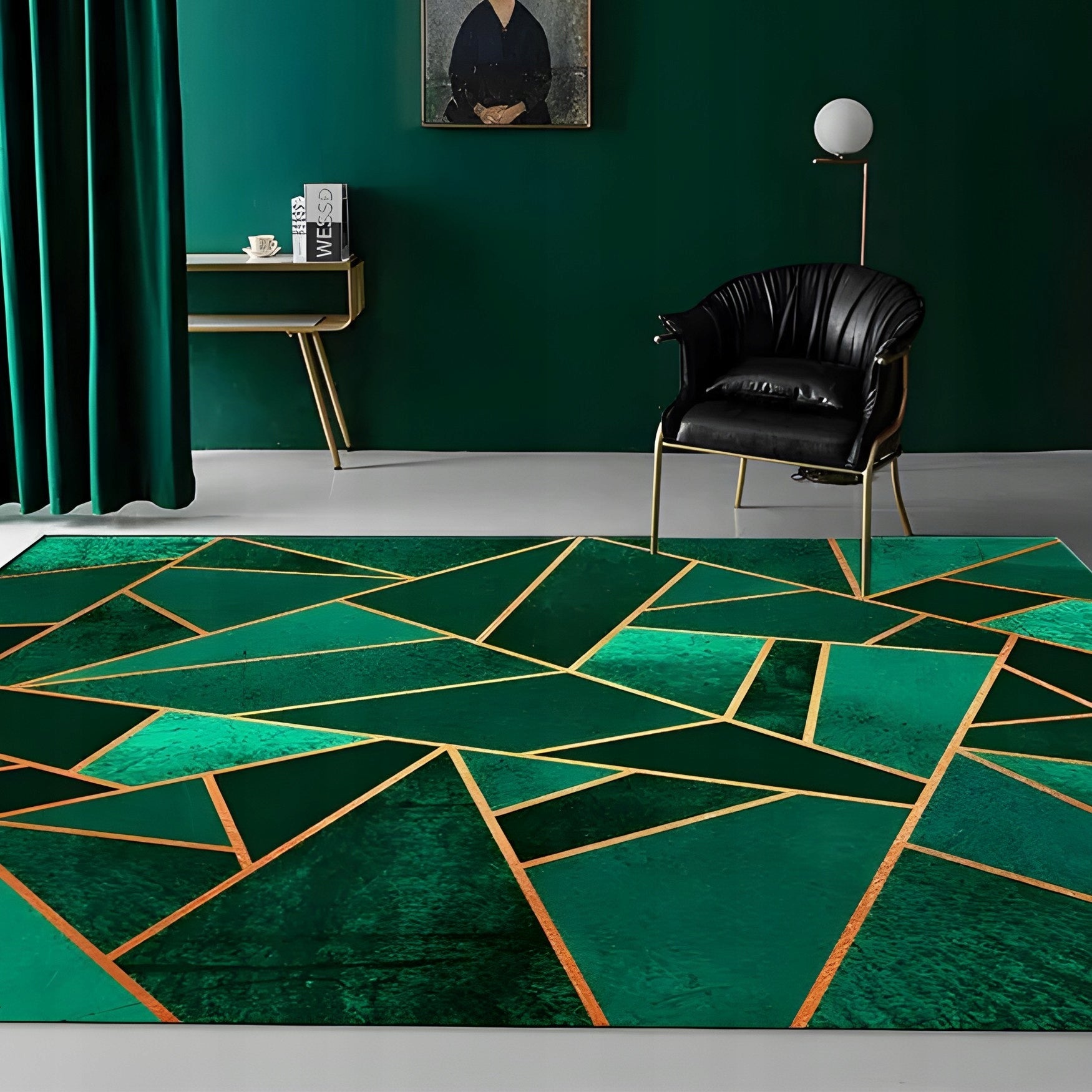 - Stilius ir dizainas: Unikalus žalias dizainas su aukso spalvos geometriniais trikampių akcentais suteikia prabangos ir modernumo bet kuriam interjerui.