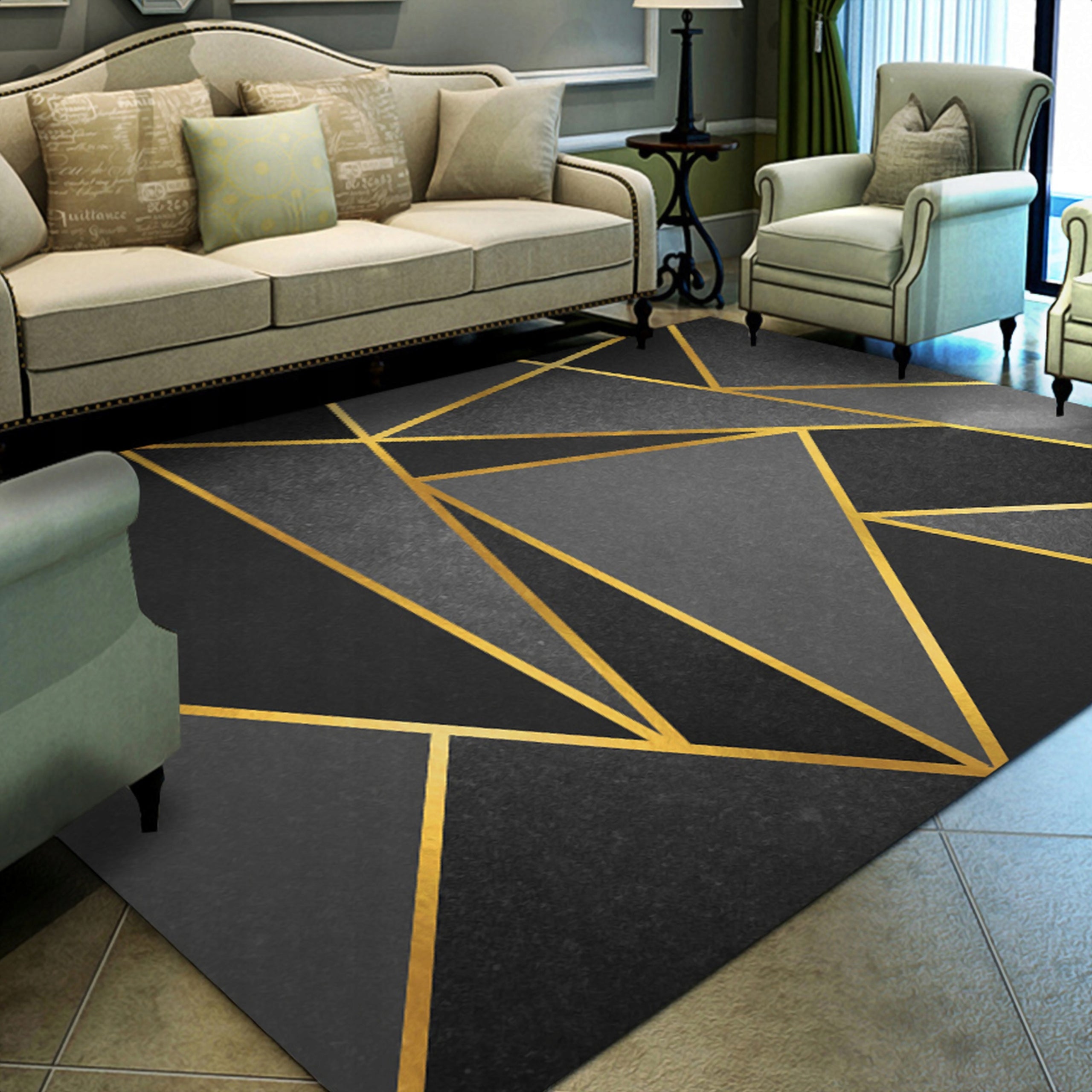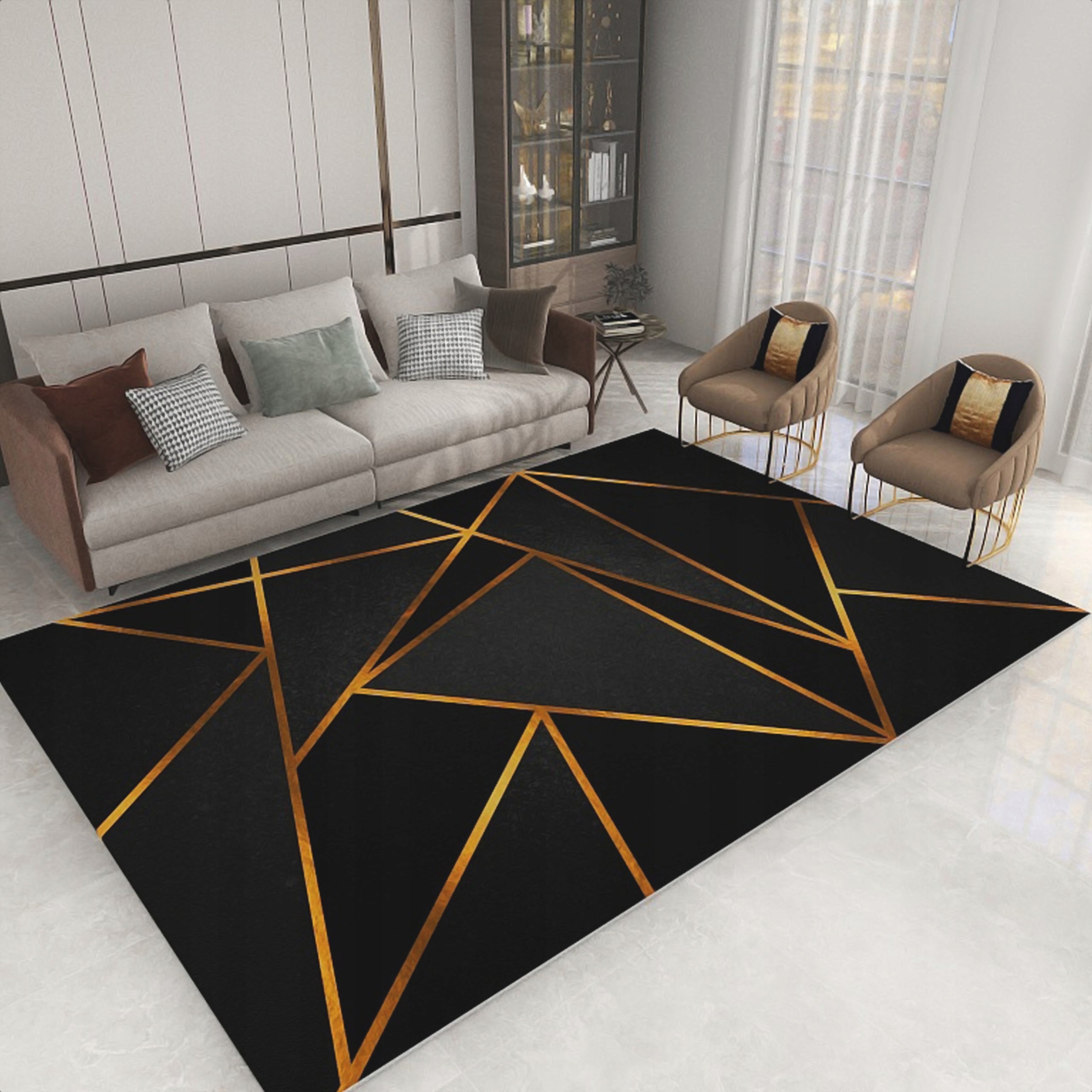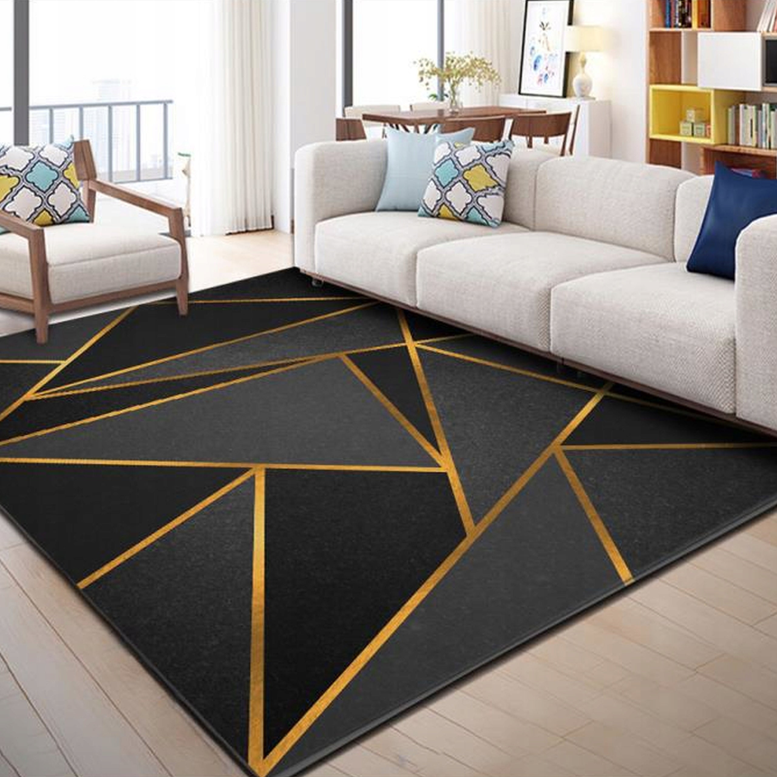 - Spalvos ir raštas: Nors juoda ir aukso spalvos yra universalios, ryškus geometrinis raštas gali nepritapti prie labai santūrių, vienspalvių interjerų, kur norima minimalizmo.