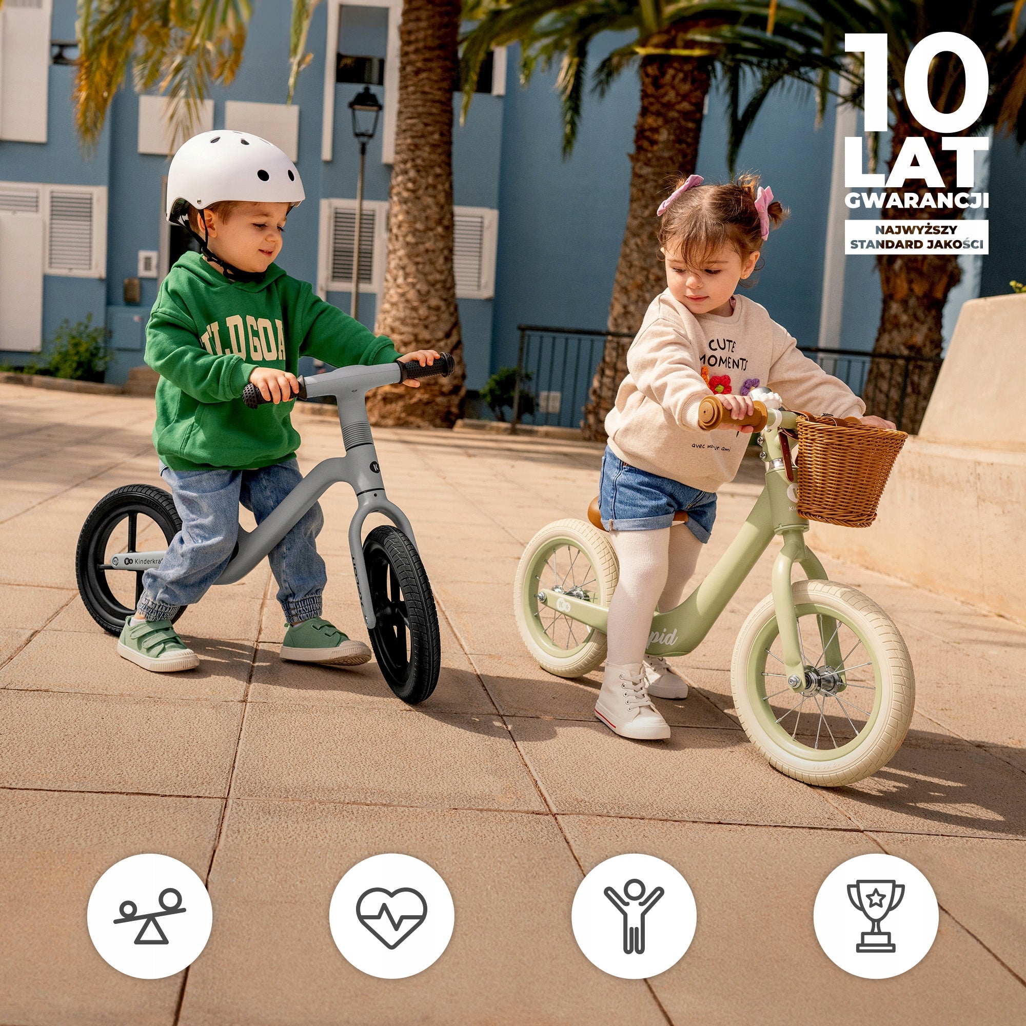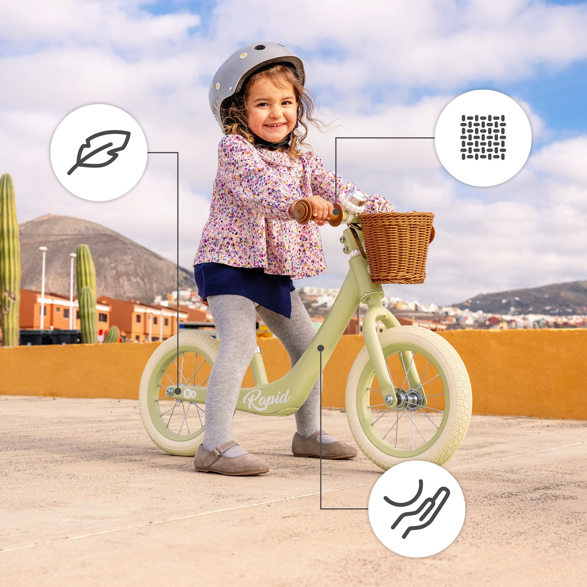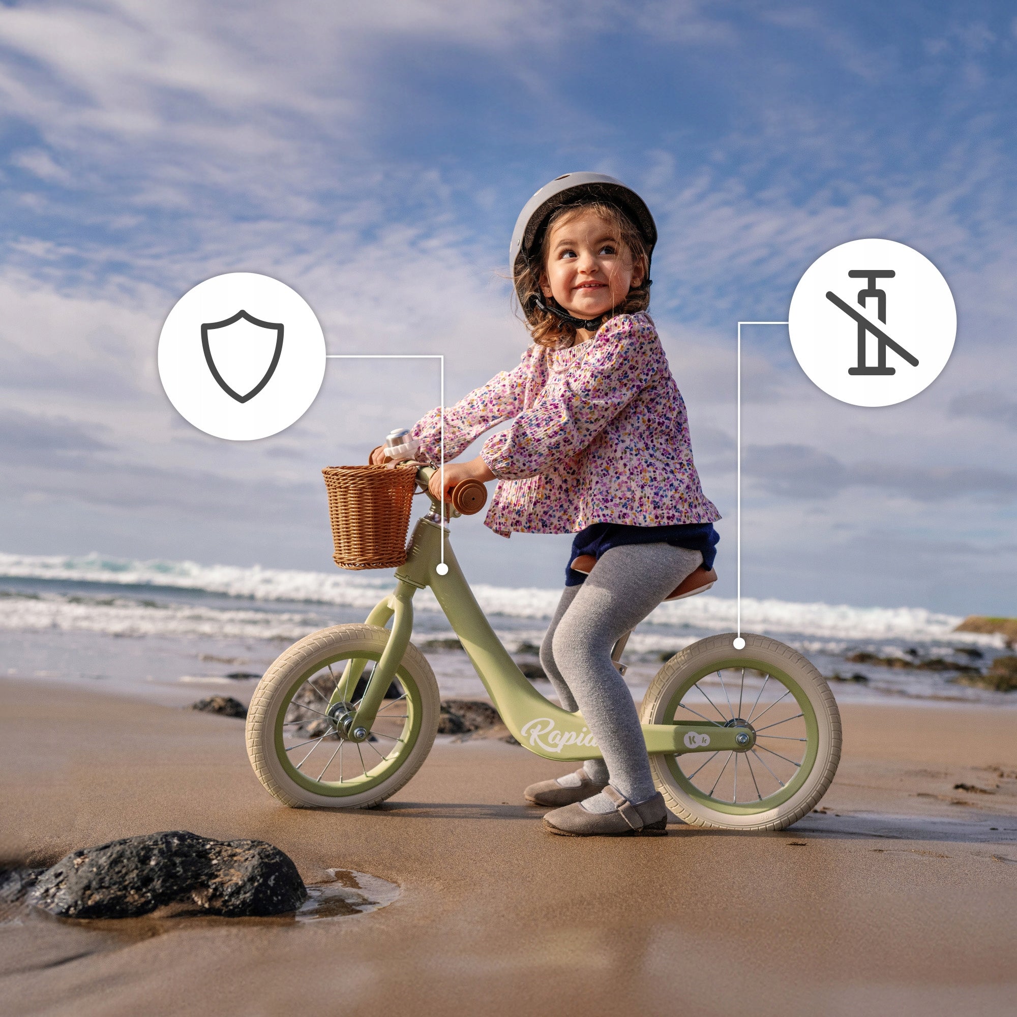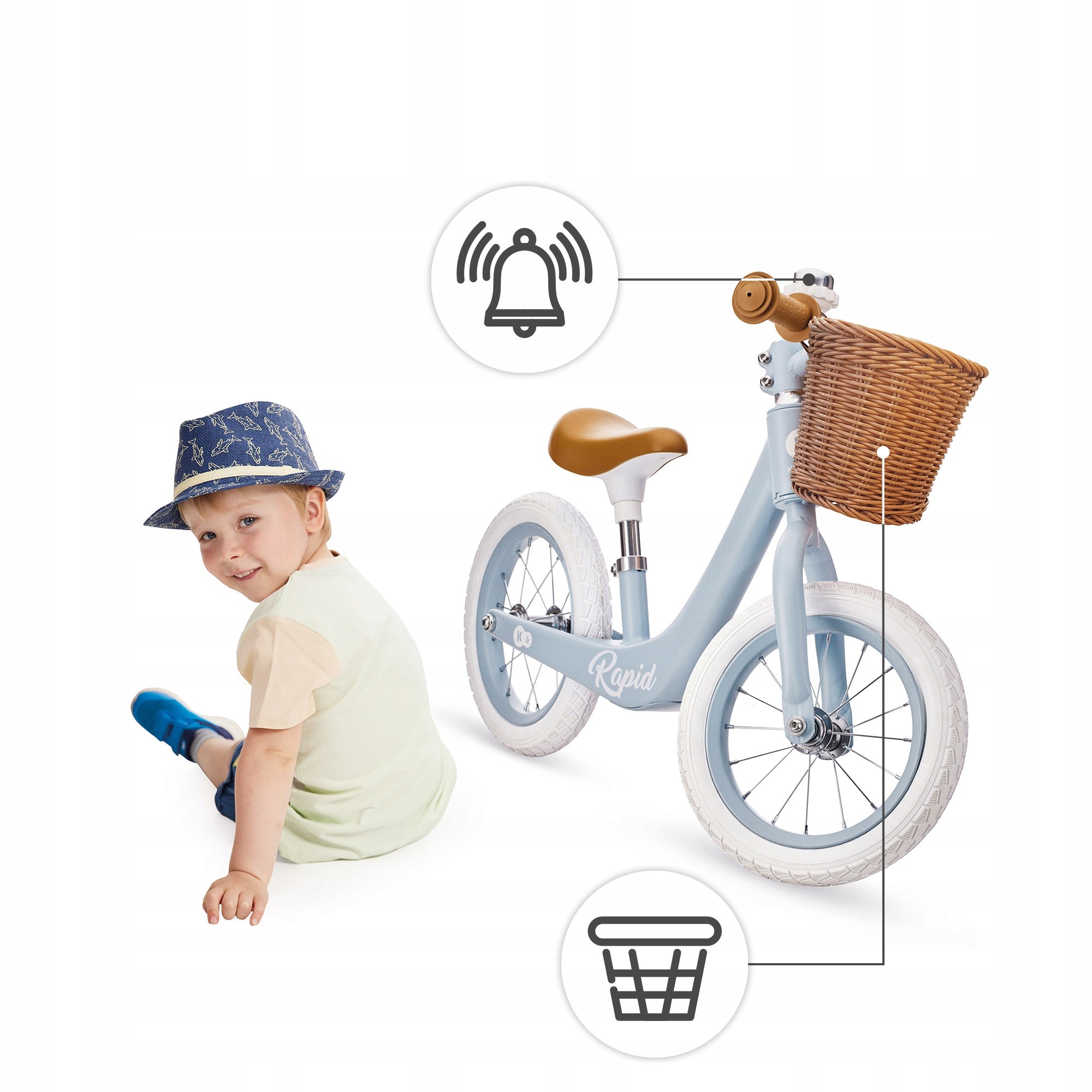 Kinderkraft RAPID 2 pasižymi ne tik funkcionalumu, bet ir ilgaamžiškumu. Stipri, bet lengva magnio lydinio rėmo konstrukcija yra atspari smūgiams, vibracijoms ir korozijai, todėl dviratukas ilgai išlaikys puikią išvaizdą net ir intensyviai naudojant. Dideli, putplasčio ratai yra visiškai nereikalaujantys priežiūros, suteikia puikų sukibimą su danga ir puikiai amortizuoja nelygumus, todėl važiavimas tampa komfortiškesnis tiek lygiame šaligatvyje, tiek miško takeliu. Neslystančios rankenos ant vairo užtikrina tvirtą sukibimą ir leidžia vaikui saugiai atlikti posūkius. Stilingas retro dizainas su mėlyna spalva patiks tiek berniukams, tiek mergaitėms, o pridedamas krepšelis leis vežtis mėgstamą žaislą ar kitus smulkius daiktus.