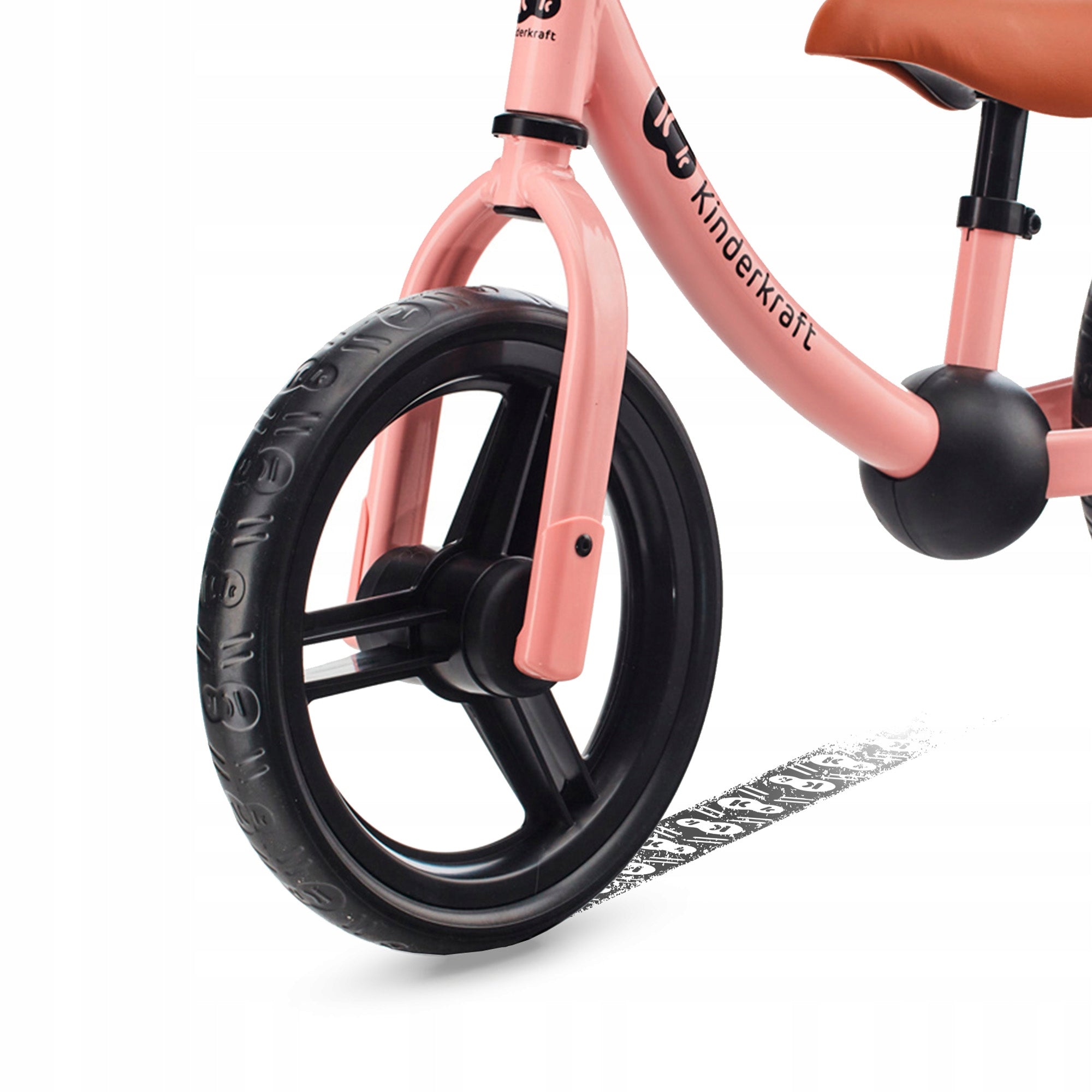 Kinderkraft 2WAY NEXT komplektuojamas su guolinėmis, nepraduriamomis putplasčio padangomis. Jos užtikrina puikią amortizaciją ir komfortą važiuojant bet kokiu reljefu – nuo lygaus asfalto iki miško takelių ar akmenuotų keliukų. Dėl šios priežasties dviratukas yra puikus pasirinkimas tiek kasdienėms kelionėms po miestą, tiek ilgesnėms kelionėms gamtoje. Originalus padangų protektorius palieka ryškų, džiuginantį taką, suteikdamas papildomą pramogą mažajam vairuotojui.