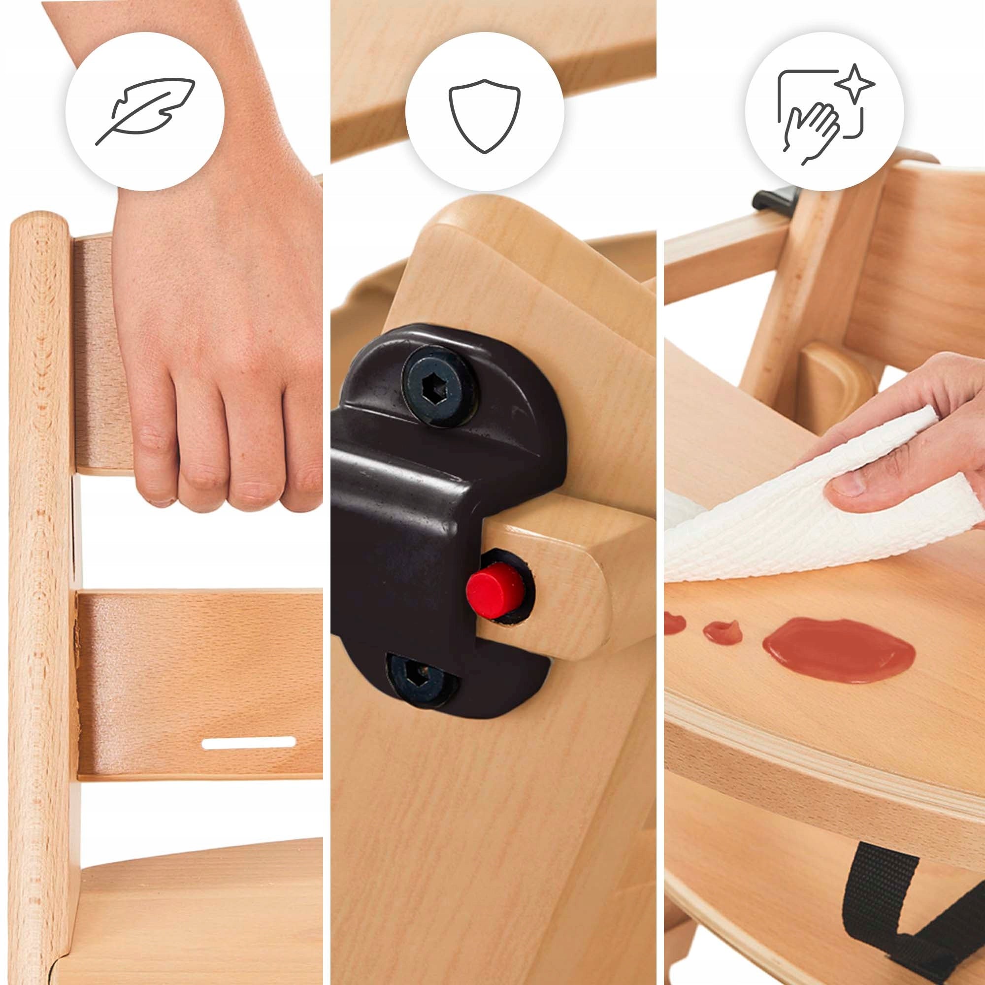 Ši kėdutė yra ne tik funkcionali, bet ir estetiška. Minimalistinis dizainas su lygiomis, natūralaus medžio paviršiais leidžia ją nepaprastai lengvai prižiūrėti. Nėra sunkiai pasiekiamų kampelių, kur galėtų kauptis maisto likučiai ar nešvarumai, todėl kėdutė išlieka higieniška ir visada paruošta kasdieniam naudojimui. Natūralaus buko medienos masyvo naudojimas užtikrina ne tik ilgaamžiškumą, bet ir subtilų grožį, kuris puikiai derės prie bet kokio interjero. Lengva konstrukcija leidžia ją patogiai perkelti ar perstatyti, pritaikant prie jūsų poreikių ir namų erdvės. Tai nesenstantis dizainas, kuris niekada nepraranda savo aktualumo.