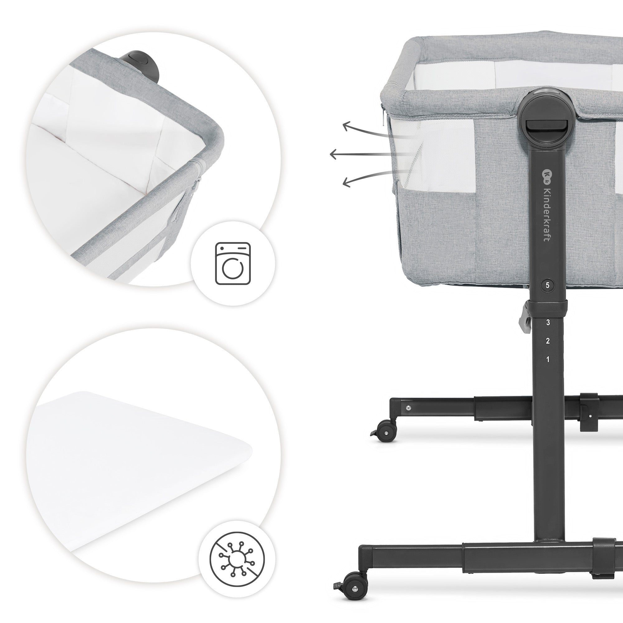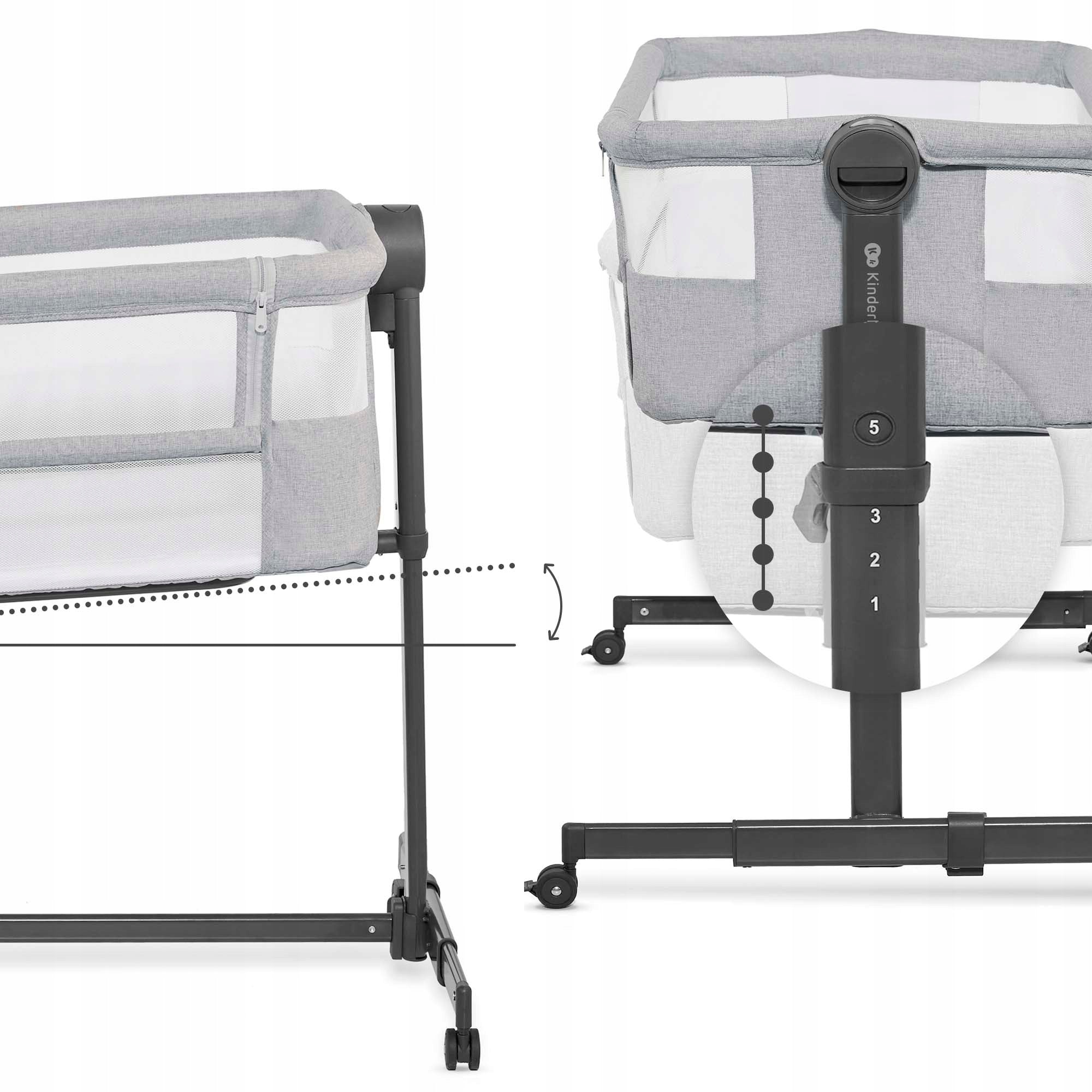 - Reguliuojamas aukštis ir pakreipimas: 5 aukščio lygiai ir 2 čiužinio pakreipimo pozicijos užtikrina optimalų pritaikymą ir kūdikio komfortą (pvz., esant slogai ar atpylinėjimui).