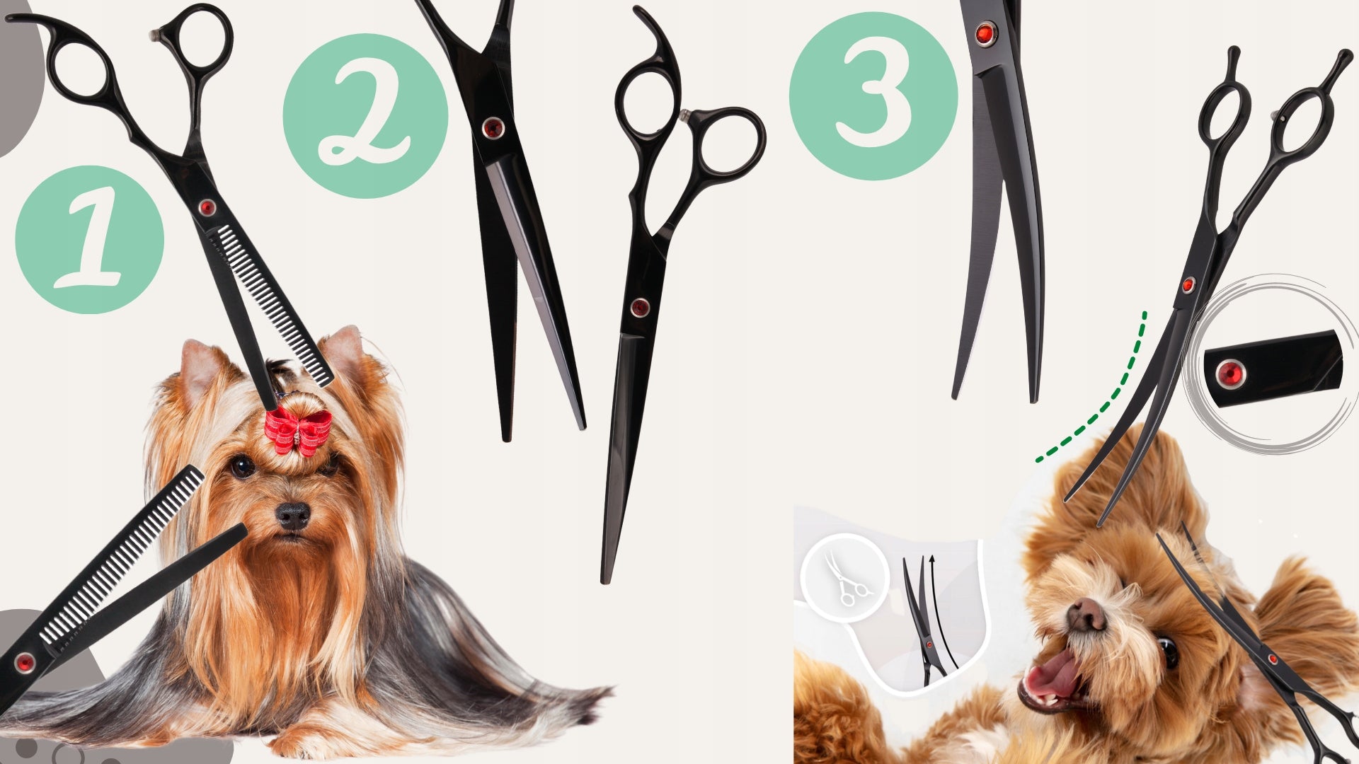 Rinkinys sukurtas atsižvelgiant į specifinius gyvūnų kirpimo poreikius. Lenktos žirklės su dvipuse, atsukama jungtimi idealiai tinka formuoti apvalias kailio dalis aplink letenas ar galvą, ypač populiarias azijietiško ir korėjietiško stiliaus šukuosenose. Retintuvai, pagaminti iš aukščiausios kokybės plieno, turi labai aštrų ašmenį ir specialius įpjovimus dantukuose, neleidžiančius plaukams slysti. Paprastos žirklės pasižymi itin aštriomis briaunomis, užtikrinančiomis sklandų kirpimą. Metalinės šukos su antistatine danga neleidžia plaukams elektrintis ir tinka daugumai šunų veislių.