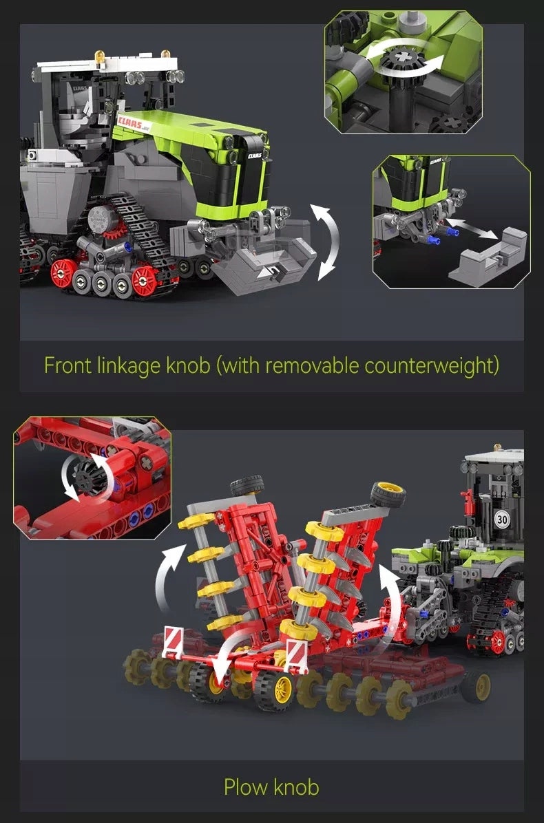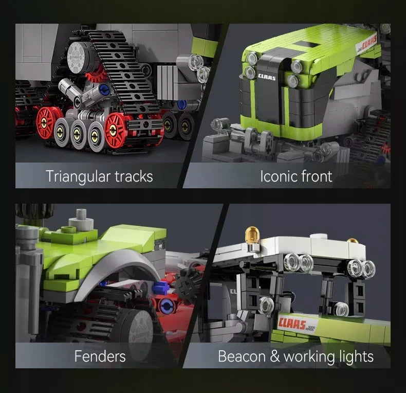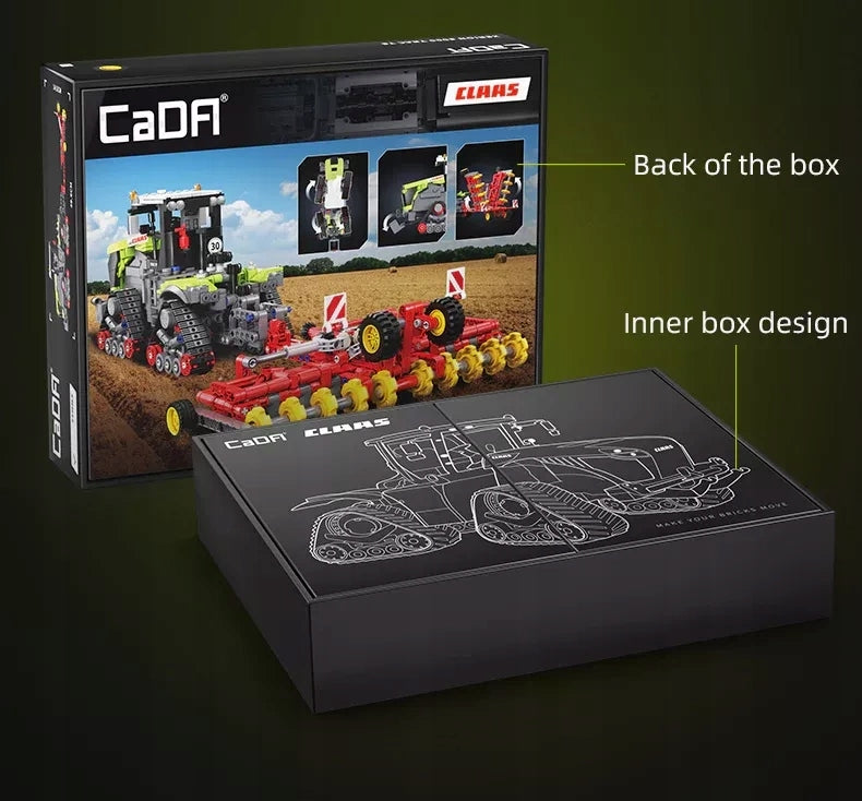 Šis modelis yra CaDA „Make Your Bricks Move“ serijos dalis, skirta lavinti vizualinę-motorinę koordinaciją ir pažintinius gebėjimus. Sukonstruotas su dideliu dėmesiu detalėms, jis atkartoja tikrojo CLAAS XERION 5000 traktoriaus bruožus. Nuo judančių vikšrų, leidžiančių įveikti įvairius paviršius, iki sudėtingų pakėlimo mechanizmų ir išardomo svarmenų – kiekvienas elementas veikia ir suteikia realistiškumo. Pilnai detalizuota kabina su vairu, sėdyne ir valdymo svirtimis, taip pat išorės detalės, tokios kaip šviesos, veidrodėliai ir laipteliai, užtikrina, kad šis modelis bus tikra akiai miela ir funkcionali kopija.