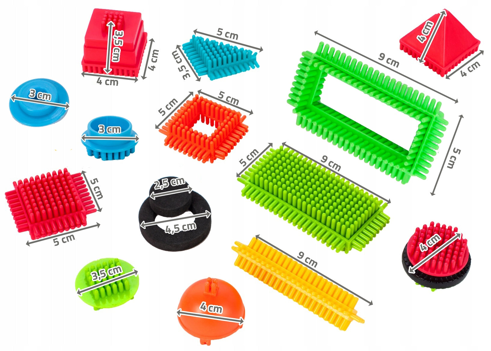 - 100 skirtingų formų ir dydžių blokelių 5 ryškiose spalvose.