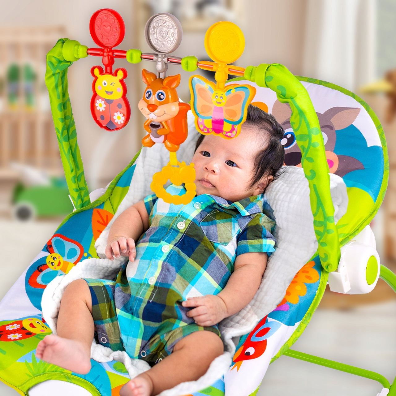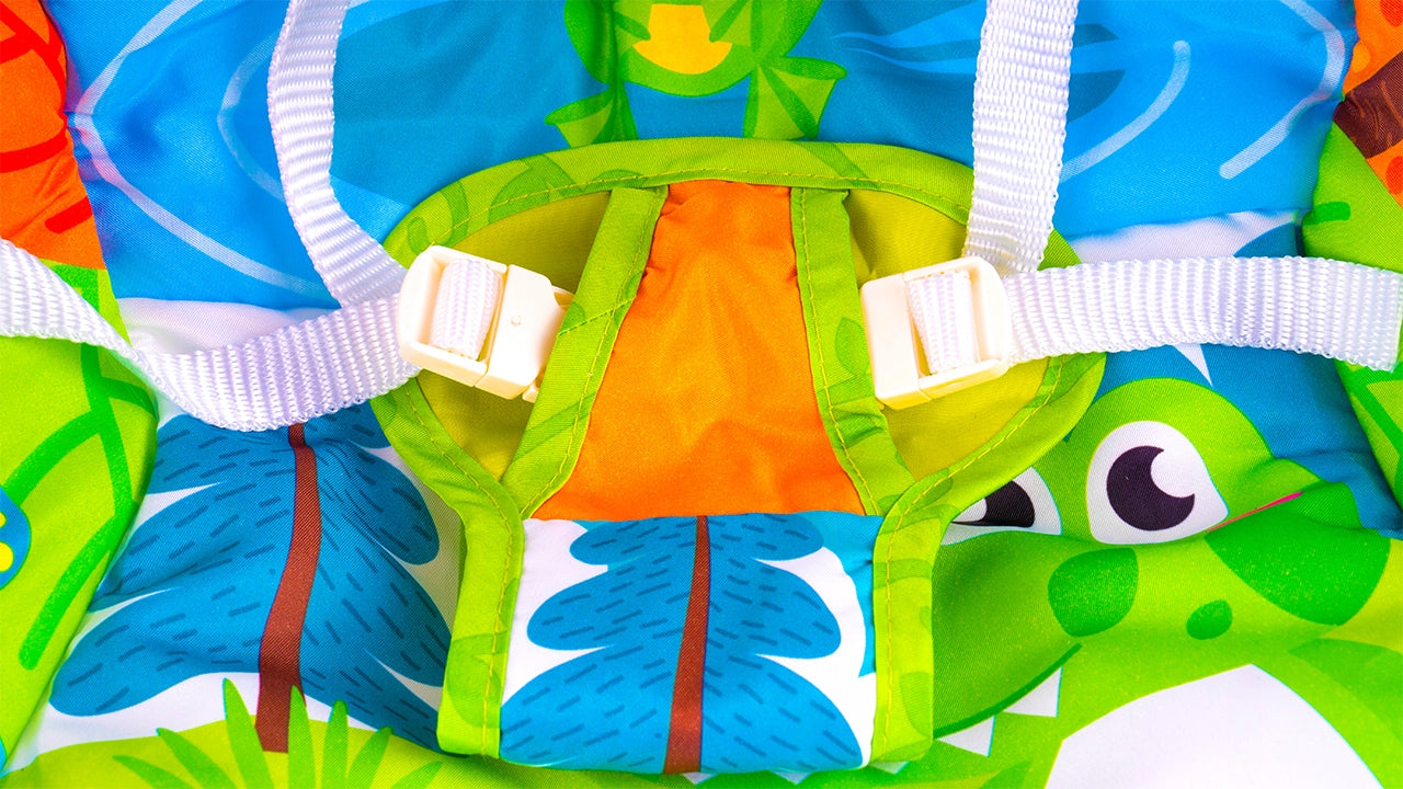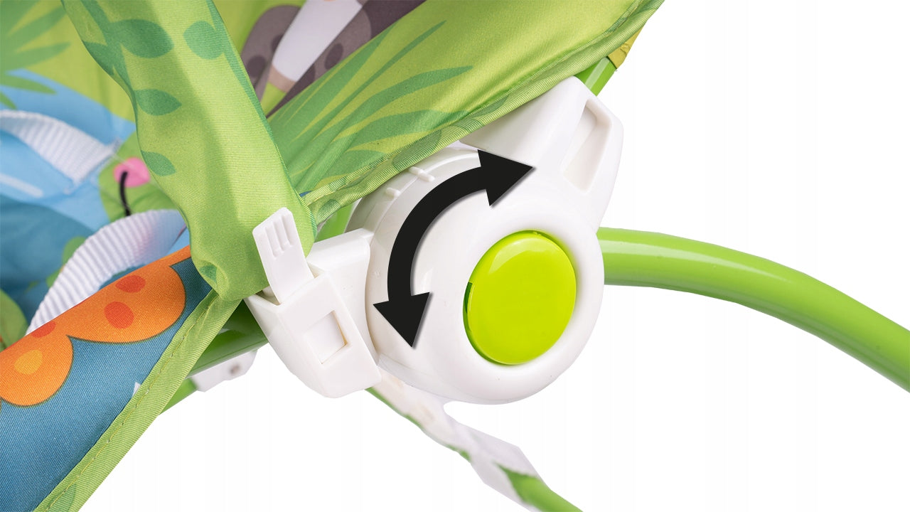 Virš sėdimosios dalies pritvirtintas lankas su trimis skirtingais žaisliukais, kurie ne tik patrauks vaiko dėmesį, bet ir skatins jo motorinius įgūdžius bei rankyčių koordinaciją. Ypač žavinga – besisukanti voveraitė, kuri groja malonų melodiją, sukurdama jaukią ir interaktyvią žaidimų aplinką. Šis lankas yra nuimamas, todėl jį galėsite patogiai nuimti, kai vaikas norės tiesiog ilsėtis, arba pritvirtinti skirtingomis kryptimis, priklausomai nuo vaiko nuotaikos.