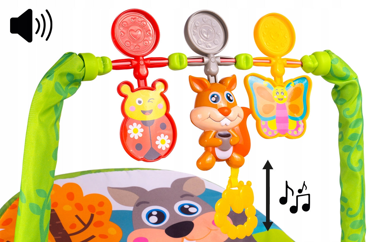 - Nuimamas žaislų lankas su garsus skleidžiančiais barškučiais ir muzikinę voveraitę skatina vaiko lavinimą.