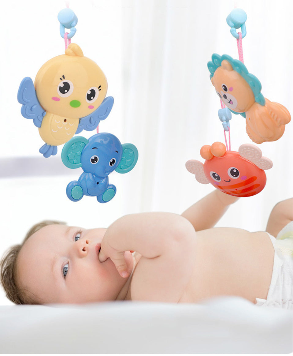 - 5 skirtingos, atsegamos pakabinamos barškučiai/žaisliukai