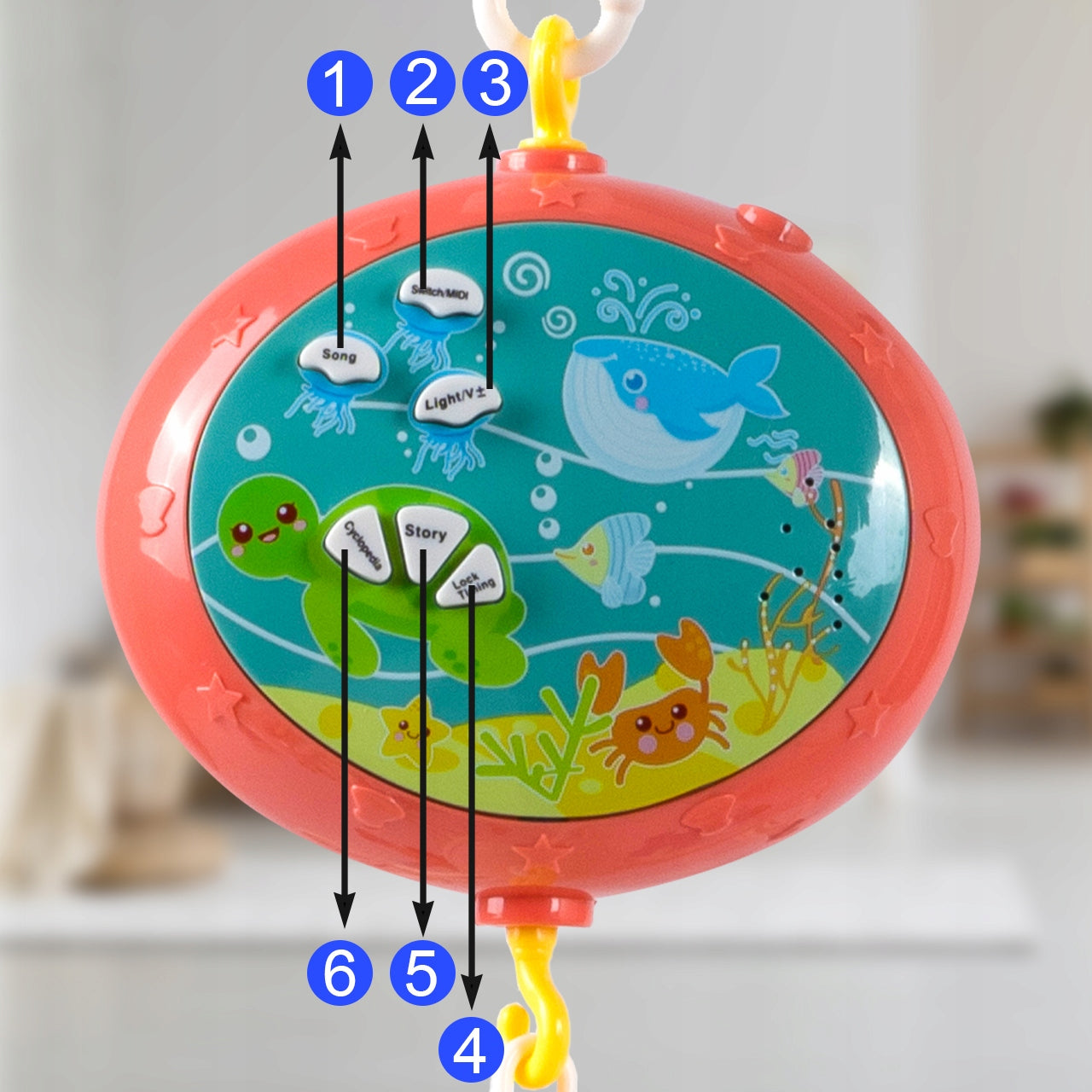Ši karusėlė siūlo išskirtinį funkcionalumą, kurį lengva valdyti. Visos funkcijos pasiekiamos tiesiogiai iš nuotolinio valdymo pultelio, kurį lengva naudoti. Jis leidžia pasirinkti iš daugybės melodijų, pasakėlių, dainelių ir mokomųjų programėlių anglų kalba. Galima reguliuoti garsumą, pasirinkti norimą kūrinį, įjungti ar išjungti besisukančią platformą ir švieseles. Ypač naudingas yra integruotas laikmatis, kurio dėka galite nustatyti, kiek laiko karusėlė turėtų groti (10, 20, 30, 40, 50 arba 60 minučių), po kurio laiko ji automatiškai išsijungs. Tai leidžia jums kontroliuoti vaiko miego ritualus ir taupyti baterijos energiją.