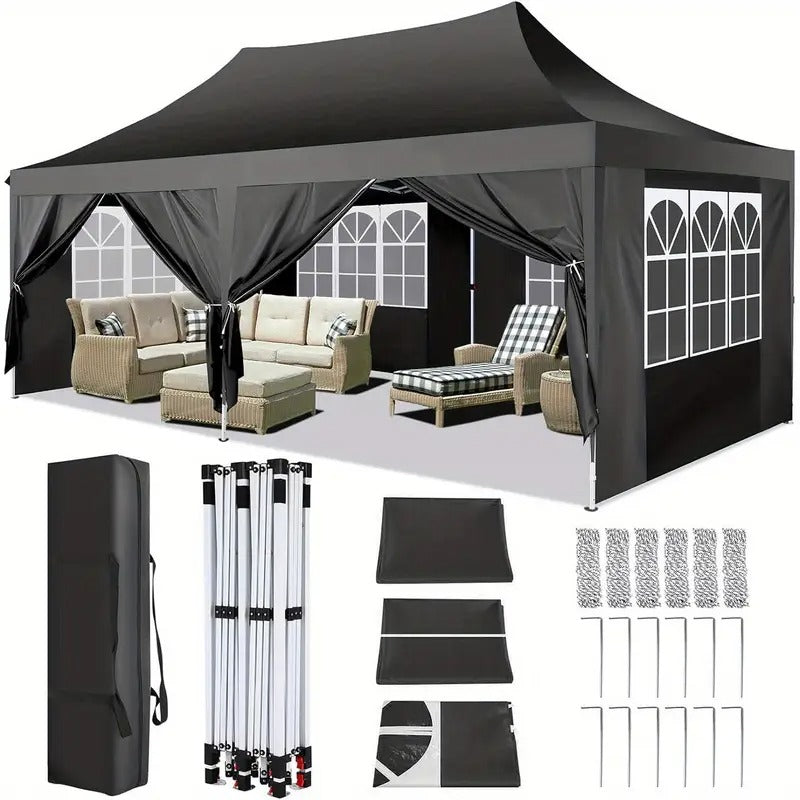 Lauko palapinė paviljonas 3,05x6,1 m juodos spalvos – tai elegantiškas ir itin patvarus pasirinkimas jūsų šventėms, vestuvėms, vakarėliams ar poilsiui sode. Ši didelė pavėsinė pagaminta iš aukštos kokybės medžiagų, turi tvirtą šešiakampį rėmą, reguliuojamą aukštį ir yra greitai bei paprastai surenkama vos dviejų žmonių pagalba. Komplekte rasite 6 nuimamas šonines sieneles su langais, kurios suteikia galimybę pasirinkti uždarą arba atvirą variantą – priklausomai nuo oro sąlygų ar renginio pobūdžio.
