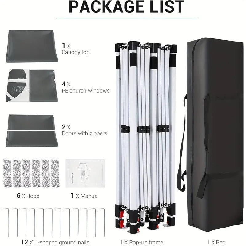 Šampano spalva sukuria šiltą ir rafinuotą atmosferą, kuri ypač dera prie iškilmingų progų. Palapinė talpina 5–8 staliukus arba 8–12 žmonių, todėl ji idealiai tinka tiek nedideliems vakarėliams, tiek didesnėms šventėms. Komplekte yra 6 nuimamos sienelės su langais, leidžiančios pritaikyti erdvę pagal oro sąlygas ar renginio poreikius. Papildomai pridėtas nešiojimo krepšys, smėlio maišai ir žemės staklės, kad konstrukcija būtų stabili net ir vėjuotu oru.