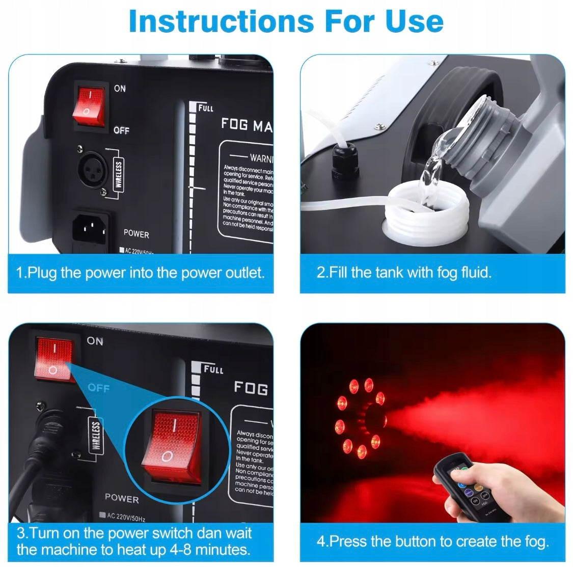 Šis dūmų generatorius pasižymi paprastu valdymu ir paruošimu darbui. Svarbu atminti, kad prietaisas parduodamas be dūmų skysčio, todėl jį reikės įsigyti atskirai. Užpildžius specialų skystį į tam skirtą bakelį ir užsukus dangtelį, belieka tik prijungti prietaisą prie elektros tinklo ir imtuvo signalo. Įjungus maitinimo jungiklį į padėtį "ON", prietaisas pradeda kaitinti. Po trumpo įkaitimo laiko, belaidis nuotolinio valdymo pultas leidžia lengvai paleisti dūmų išleidimo funkciją, suteikiant visišką kontrolę Jūsų renginio metu. Didelis dėmesys skiriamas saugumui: prietaise įrengtos dvigubos apsaugos sistemos su temperatūros jutikliu ir saugikliu. Jei prietaiso temperatūra pakyla iki pavojaus ribos, automatinis temperatūros reguliatorius nutrauks maitinimą, apsaugodamas nuo perkaitimo.