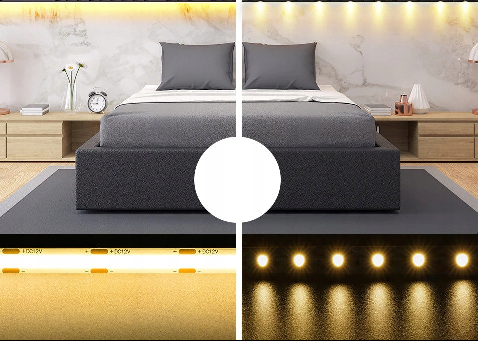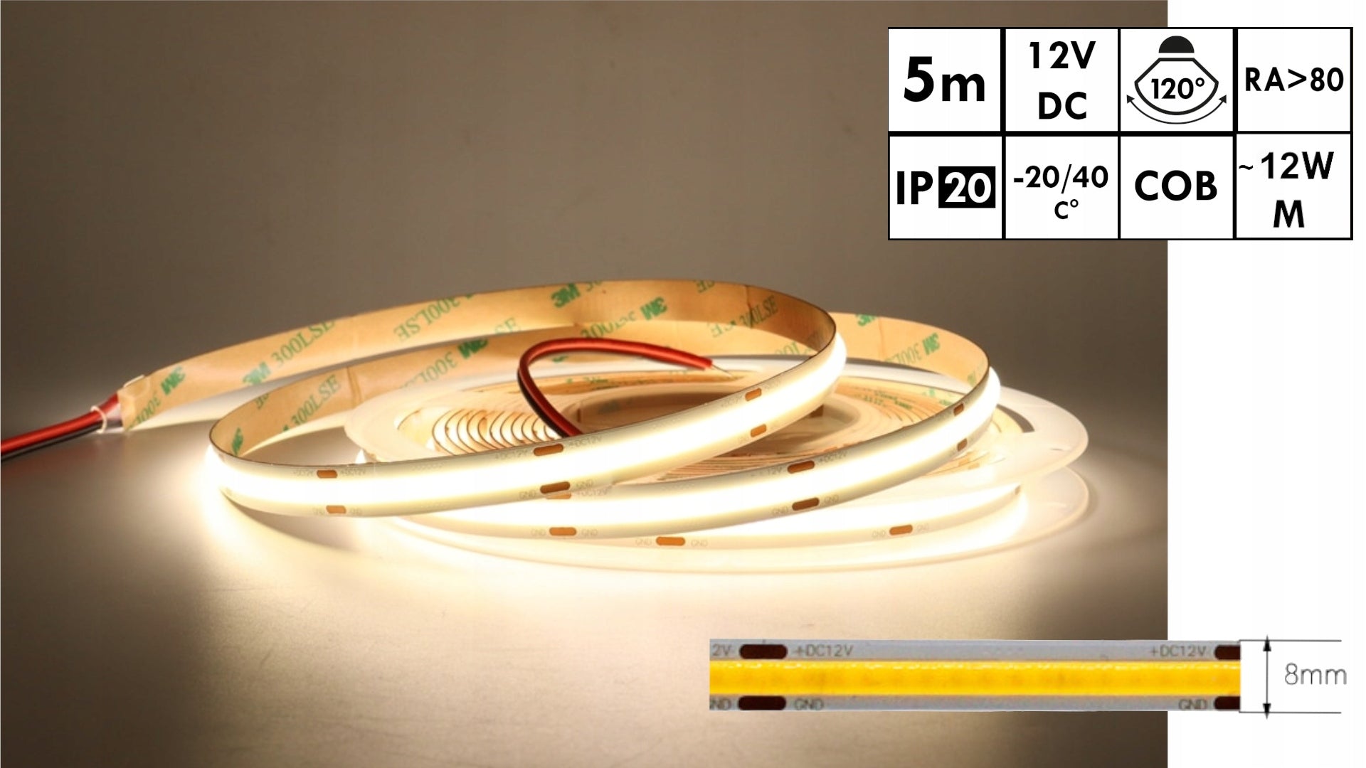 Viena didžiausių šios COB (Chip-on-Board) LED juostos privalumų yra jos gebėjimas skleisti visiškai vientisą šviesą. Skirtingai nuo tradicinių LED juostų, kuriose matomi pavieniai šviesos diodai, COB technologija leidžia diodus išdėstyti ypač tankiai ant vieno lusto, taip sukuriamas tolygus šviesos efektas. Ši juosta pasižymi ne tik išskirtiniu šviesos vienodumu, bet ir kompaktiškais matmenimis: vos 2,3 mm aukščio ir 8 mm pločio, todėl ji lengvai pritaikoma net ir siauriausiose vietose, neapkraunant dizaino. Tai puikus pasirinkimas norint pasiekti modernų ir švarų apšvietimo sprendimą.