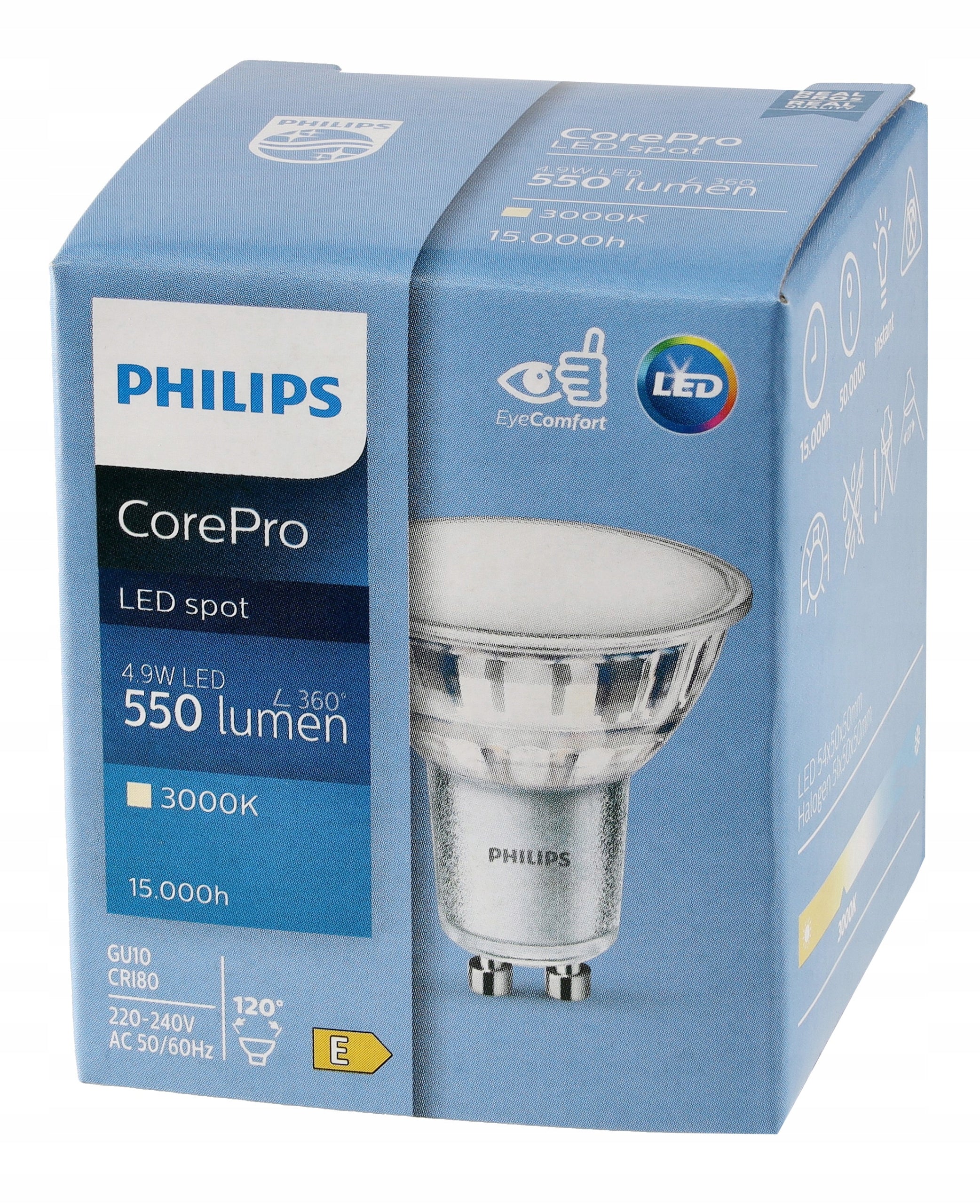 Šios „Philips CorePro“ LED lemputės yra moderni ir itin efektyvi alternatyva įprastiems halogeniniams šviestuvams. Jų energijos suvartojimas tesiekia 4,9W, o tai leidžia sutaupyti iki 80% elektros energijos, palyginti su tradicinėmis 50W halogeninėmis lemputėmis.Nepaisant mažų sąnaudų, jos suteikia pakankamai ryškų 550 lm šviesos srautą. Dėl plataus 120° spindulio kampo šviesa pasiskirsto tolygiai, apšviesdama didesnį plotą ir vengdama aštrių šešėlių. Tai puikus pasirinkimas tiems, kurie ieško ne tik funkcionalumo, bet ir estetikos bei ekonomiškumo.