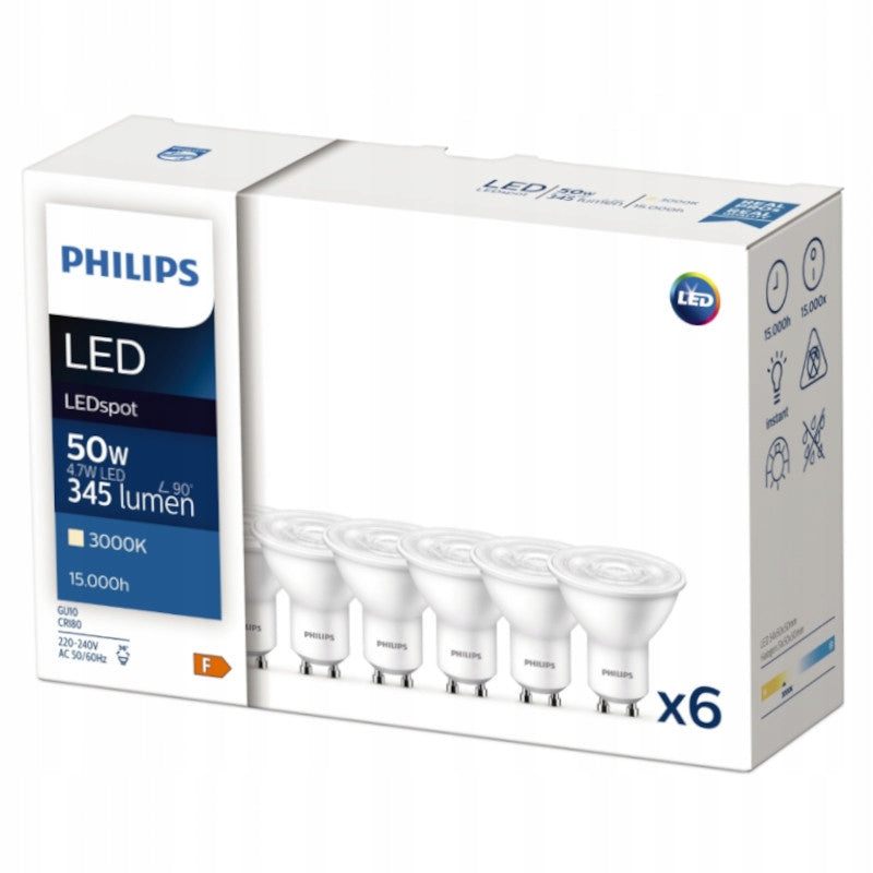 LED lemputė GU10 6x PHILIPS 4.7W = 50W 345lm Šiltai balta 3000K CorePro 36°