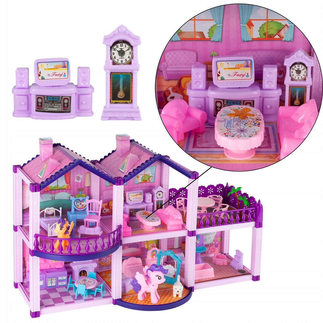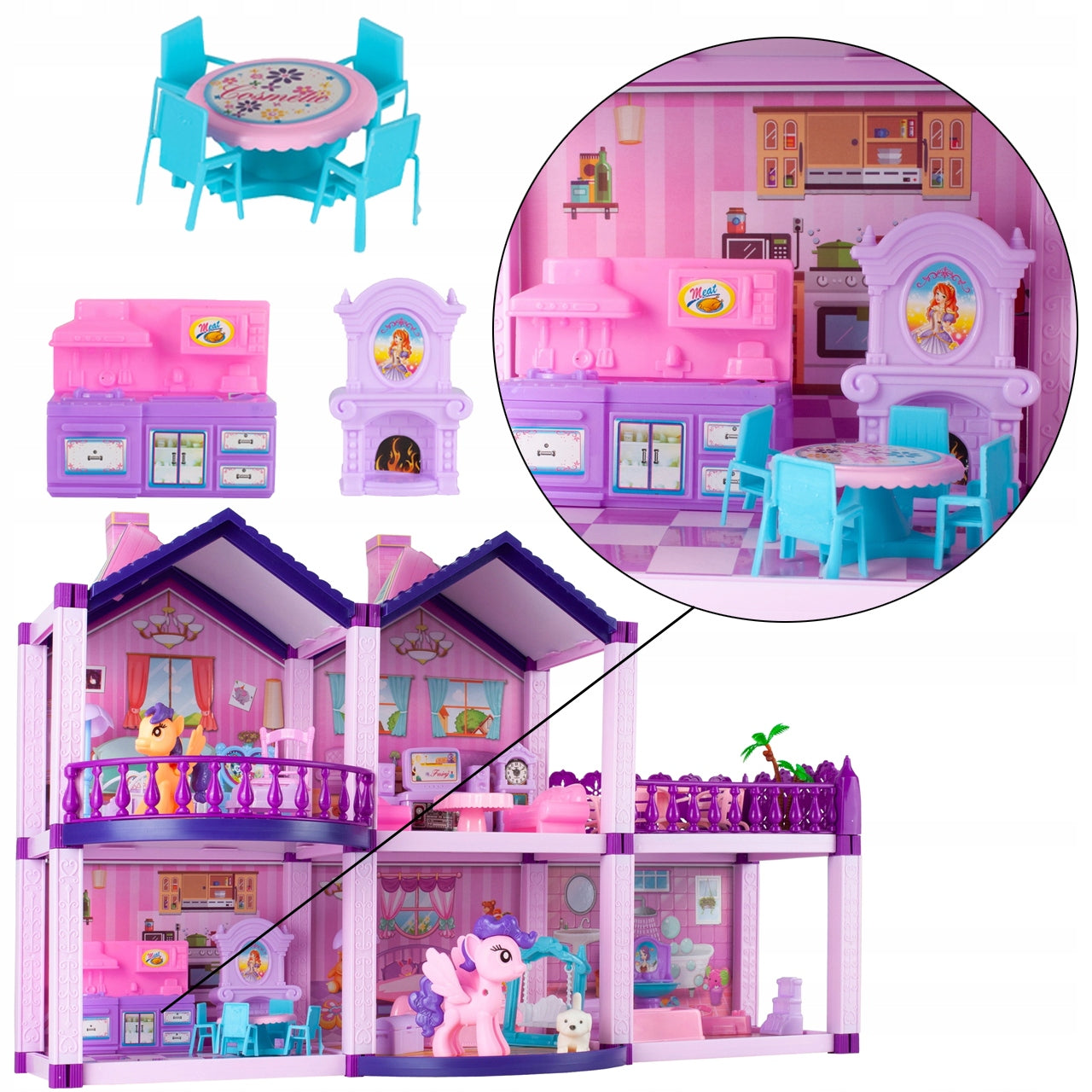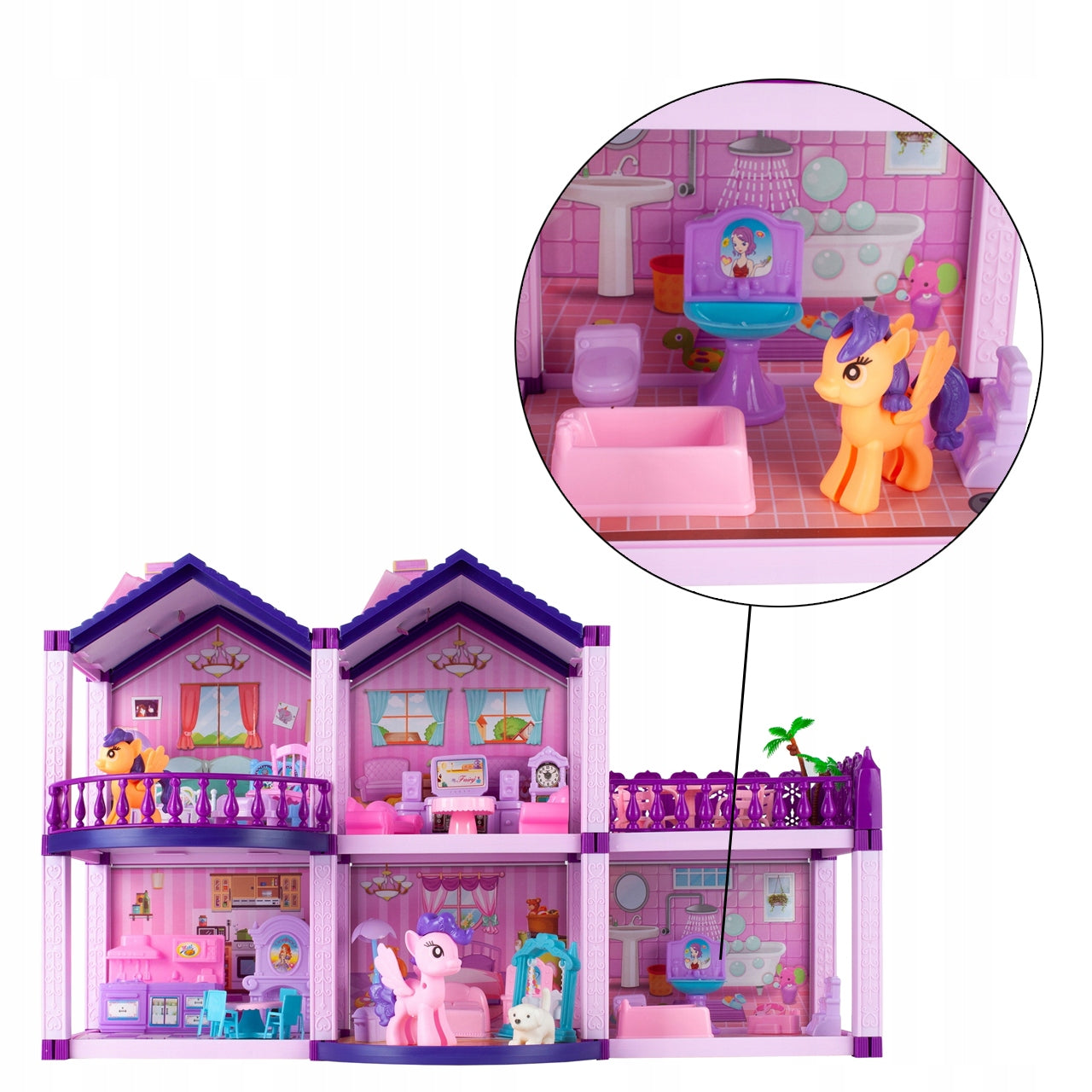 Šis lėlių namelis yra ne tik gražus statinys, bet ir pilnavertis žaidimo rinkinys. Jame rasite viską, ko reikia iš karto pradėti nuotykius: du mieli kucykai (rožinis ir oranžinis), mažas šuniukas, dekoratyvinė palmė. Taip pat komplekte yra gausus baldų ir aksesuarų pasirinkimas, atspindintis tikro namo interjerą: modernus televizoriaus ir garso sistemos komplektas, virtuvėlė su priedais, trys stalai, devyni kėdutės, lagaminėlis, dvi tualetinės spintelės, baseinas, vonios kambario organizatorius su rankšluosčiais, tualetas, praustuvas, židinys, vonia, dušas, du pastatomi šviestuvai, du skirtingi lovų komplektai, fotelis, sofa, klaviatūra ir stovintis laikrodis. Visi šie elementai leidžia vaikams įrengti namelį ir sukurti realistišką aplinką.