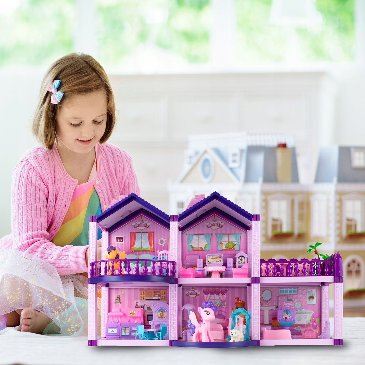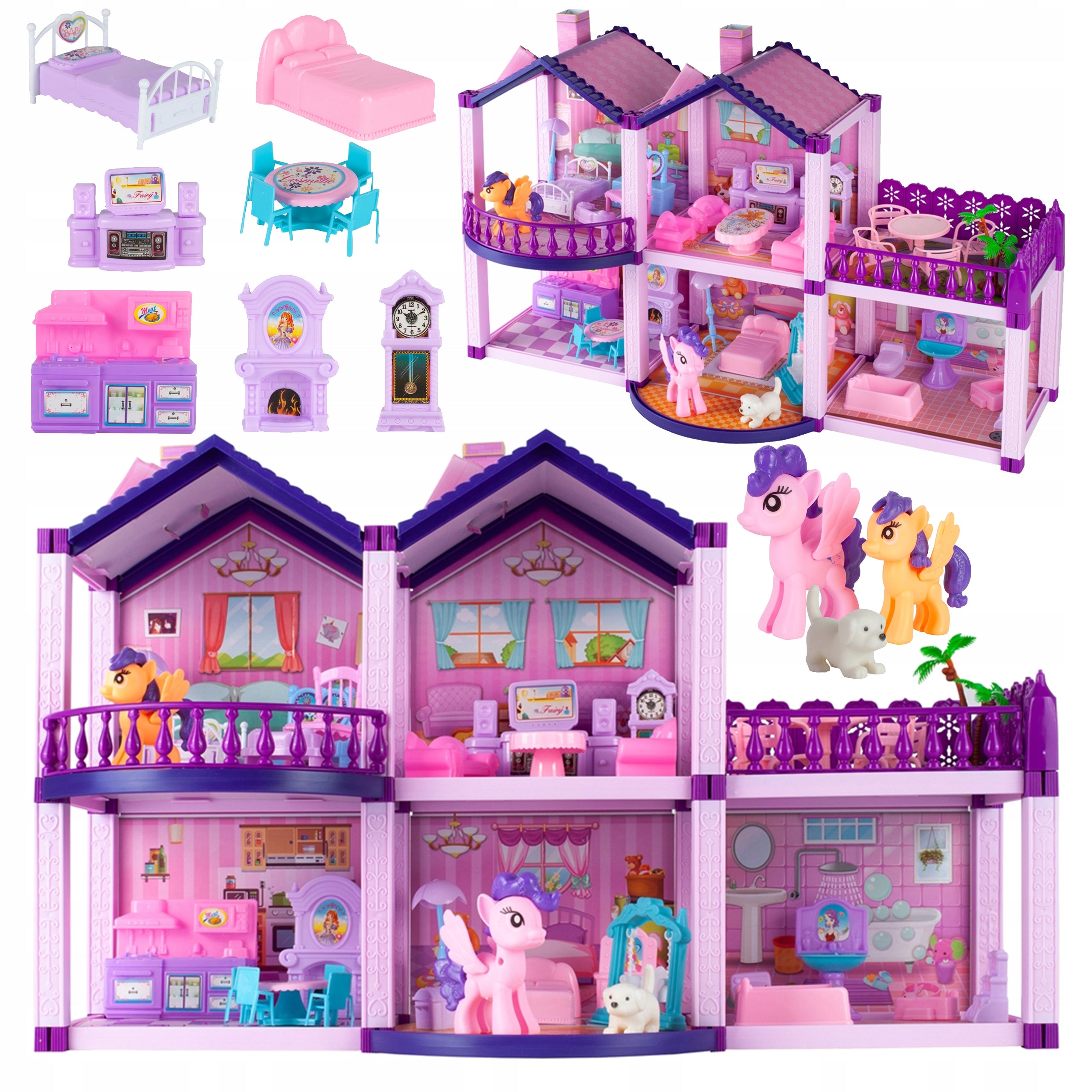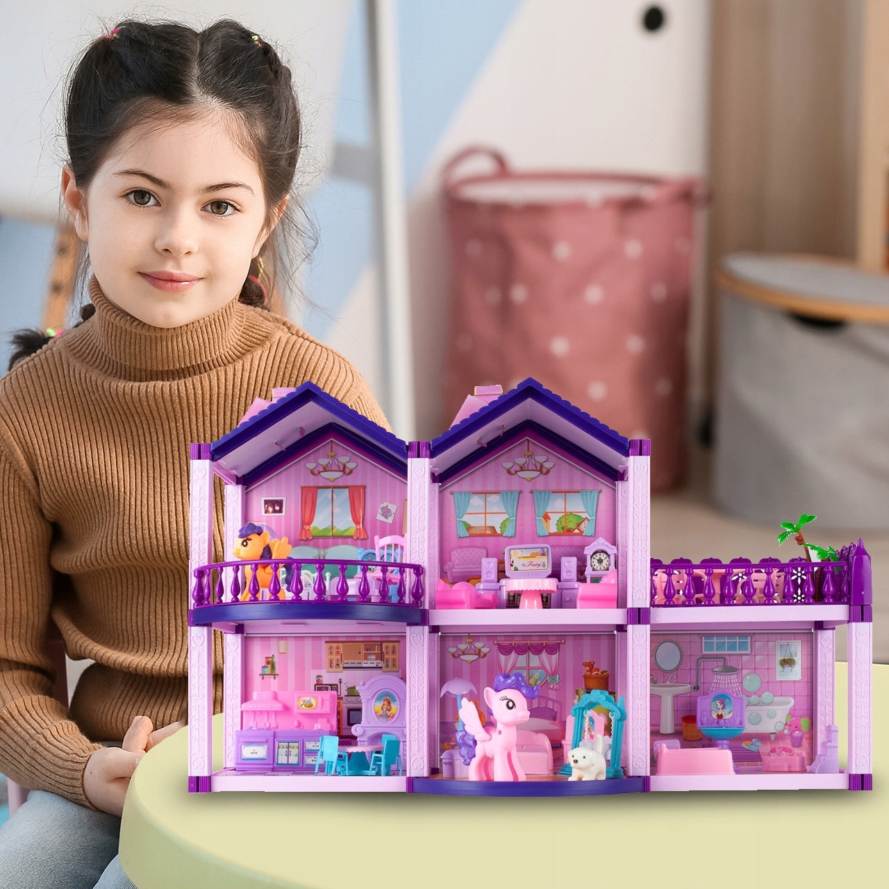 Šis lėlių namelis yra ne tik gražus statinys, bet ir pilnavertis žaidimo rinkinys. Jame rasite viską, ko reikia iš karto pradėti nuotykius: du mieli kucykai (rožinis ir oranžinis), mažas šuniukas, dekoratyvinė palmė. Taip pat komplekte yra gausus baldų ir aksesuarų pasirinkimas, atspindintis tikro namo interjerą: modernus televizoriaus ir garso sistemos komplektas, virtuvėlė su priedais, trys stalai, devyni kėdutės, lagaminėlis, dvi tualetinės spintelės, baseinas, vonios kambario organizatorius su rankšluosčiais, tualetas, praustuvas, židinys, vonia, dušas, du pastatomi šviestuvai, du skirtingi lovų komplektai, fotelis, sofa, klaviatūra ir stovintis laikrodis. Visi šie elementai leidžia vaikams įrengti namelį ir sukurti realistišką aplinką.