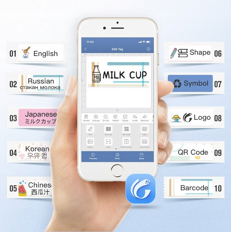 Sutaupykite laiką ir pinigus: Bevielis lipdukų įrenginys nereikalauja brangių rašalų kasetėmis, tik terminių lipdukų. Jis užtikrina geros kokybės spausdinimą, puikų prilipimą, atsparumą šalčiui, aliejui, vandeniui ir didesnį atsparumą saulės spinduliams. Nuėmus lipdukus, jie palieka mažai pėdsakų ir išlieka patvarūs daugelį metų.
