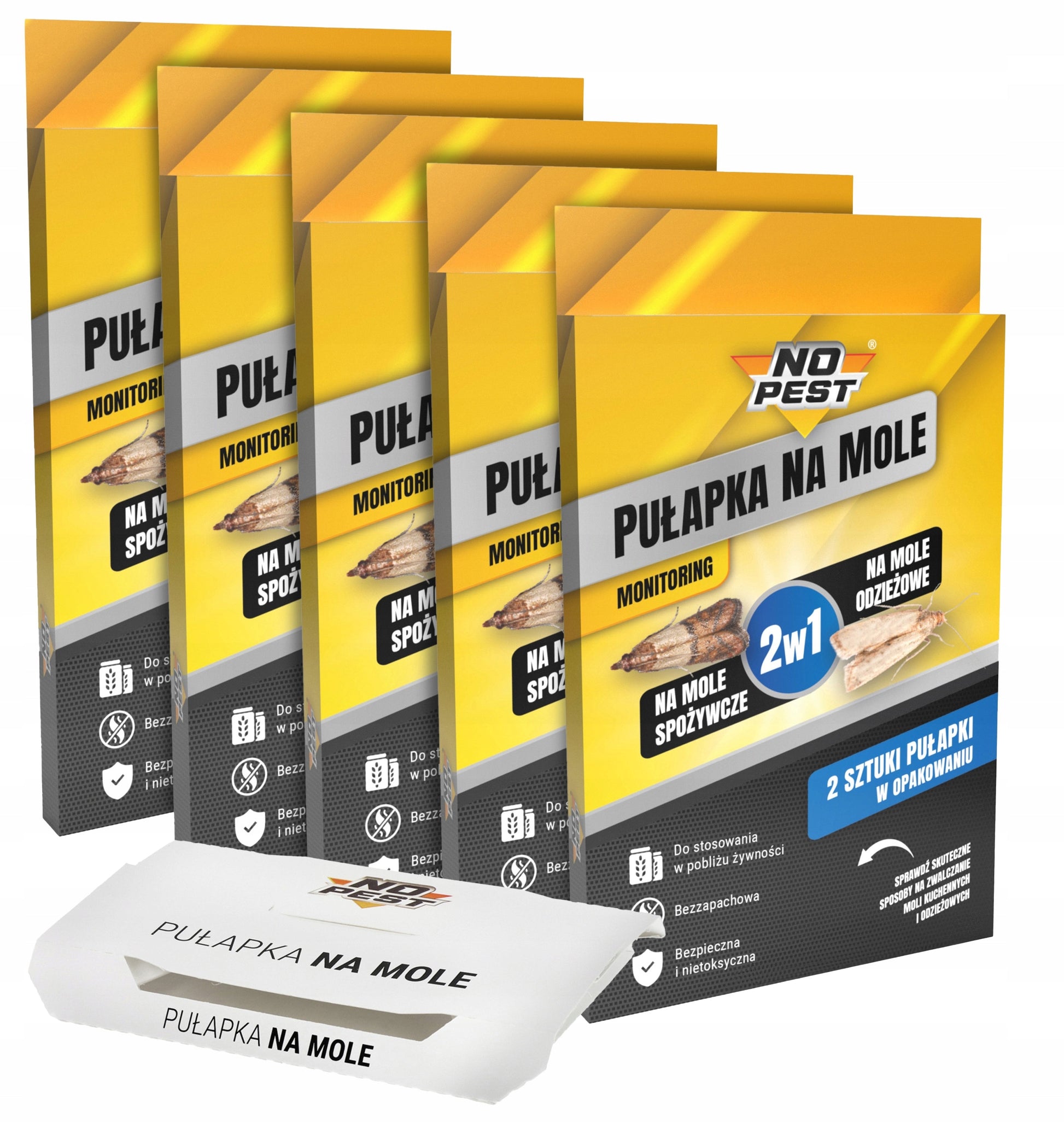 Ar žinojote, kad moliukai gali sukelti didelių nuostolių Jūsų namuose? Maistiniai moliukai lengvai užteršia didelius kiekius miltų, kruopų, riešutų, ryžių ir kitų maisto produktų, o jų lervos gali sugadinti net kokybiškiausius vilnos ar kašmyro drabužius. Kiaušinėlius deda sunkiai pasteimose vietose, todėl laiku nesiimtos priemonės gali lemti visų atsargų ar mėgstamų drabužių praradimą. No Pest® 2in1 gaudyklės yra greitas ir paprastas būdas tam užkirsti kelią. Feromonai privilioja suaugusius moliukus, neleidžia jiems daugintis, o lipnus paviršius juos sulaiko. Stebėdami sugautus moliukus, galite laiku pastebėti problemos mastą ir imtis papildomų priemonių, jei reikia.