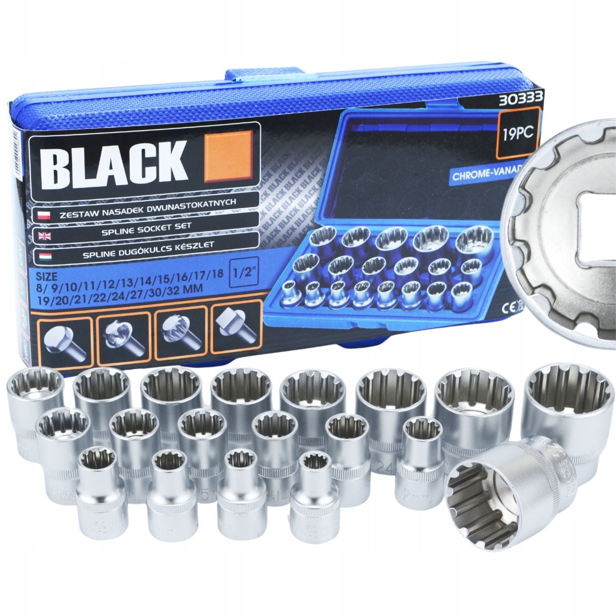 Profesionalus 19 vnt. 1/2" "SPLINE" Lizdų Raktų Rinkinys (8-32mm) - BLACK