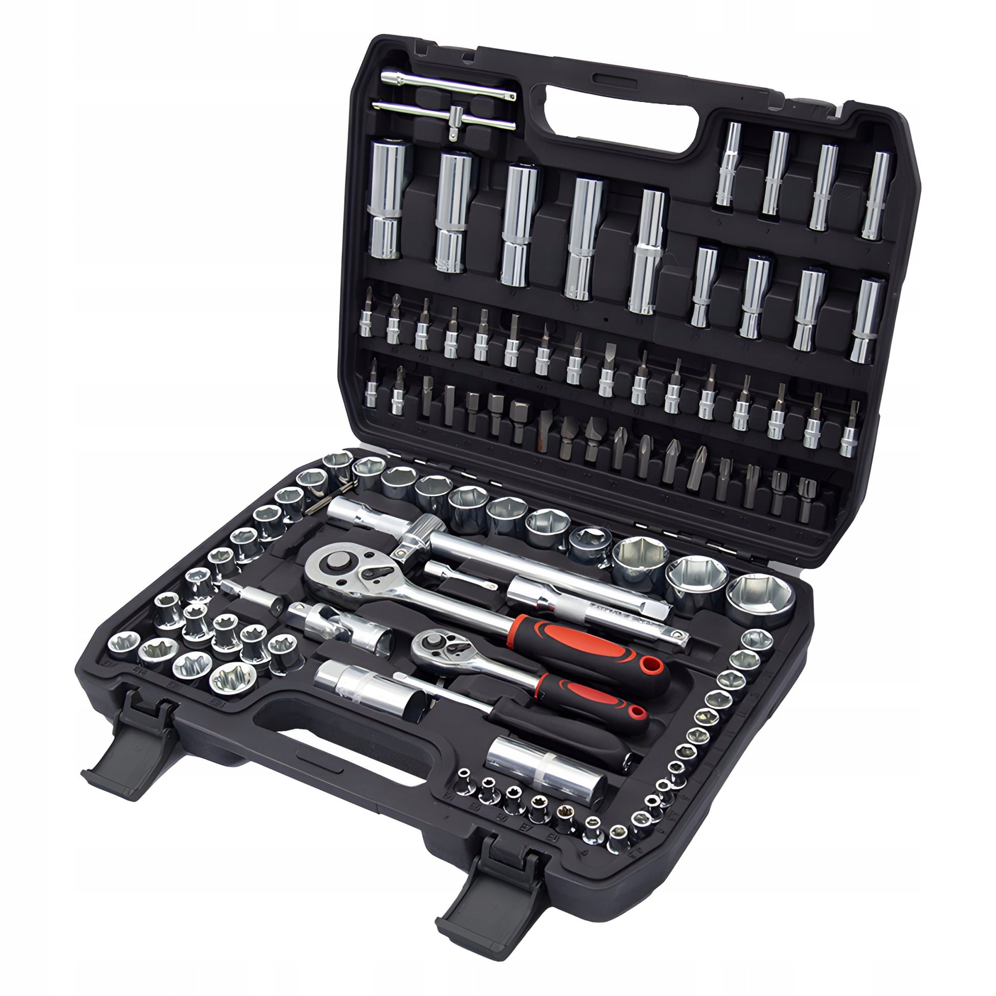 Šis 108 dalių rinkinys yra sukurtas taip, kad atitiktų pačius įvairiausius jūsų poreikius. Jame rasite platų dydžių ir tipų atsuktuvo raktų bei antgalių spektrą. Nuo standartinių 1/2" ir 1/4" lizdų iki specializuotų dalių, tokių kaip žvakių galvutės ir vidiniai TORX antgaliai – viskas sukurta tam, kad palengvintų jūsų darbą. Rinkinyje taip pat yra prailgintuvai, kardano jungtys, terkšlės ir T formos rankena, leidžianti atlikti net sunkiausiai pasiekiamus darbus. Visi įrankiai kruopščiai sudėti į tvirtą, juodos spalvos lagaminą, o ryškiai raudonos terkšlės suteikia papildomo stiliaus.