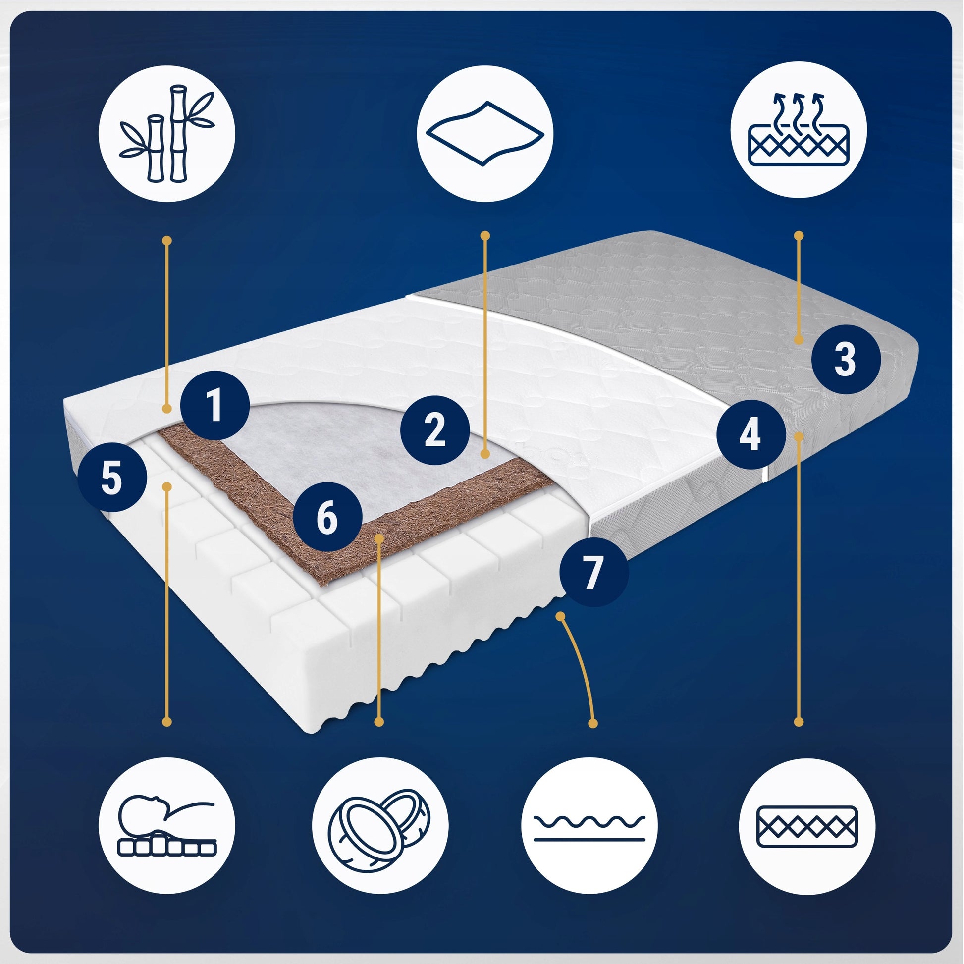 Šis čiužinys yra pagamintas naudojant aukščiausios kokybės medžiagas, skirtas užtikrinti jūsų kūdikio saugumą ir komfortą. Kokoso pluoštas, žinomas dėl savo natūralaus kietumo ir oro pralaidumo, puikiai palaiko taisyklingą stuburo vystymąsi ir užkerta kelią drėgmės kaupimuisi. „FlexPanels“ putplasčio plokštės suteikia taškinį elastingumą, užtikrinant optimalų slėgio paskirstymą ir palaikymą, nepriklausomai nuo vaiko judesių miego metu. Bambuko pluošto audinys, naudojamas čiužinio užvalkale, pasižymi antibakterinėmis savybėmis, reguliuoja drėgmę ir užtikrina termokomfortą, o papildomai dygsniuotas sluoksnis suteikia dar daugiau vėdinimo ir apsaugos nuo alergijos. Visa tai sudaro ilgalaikį ir sveiką miego pagrindą.