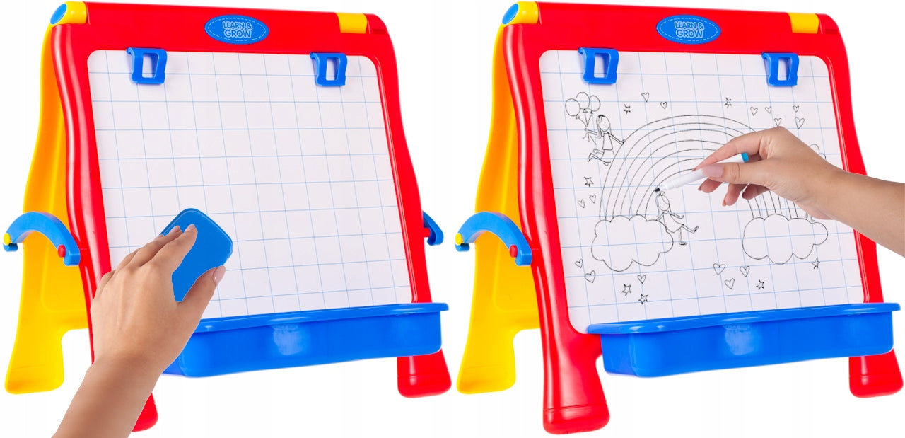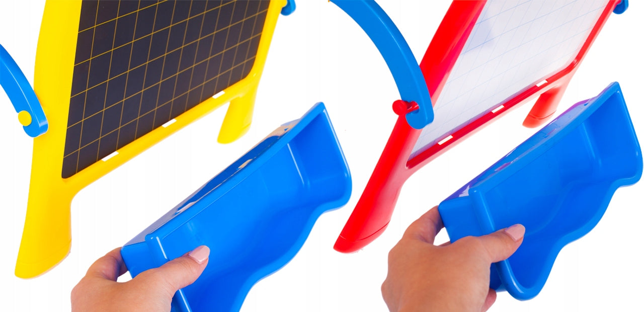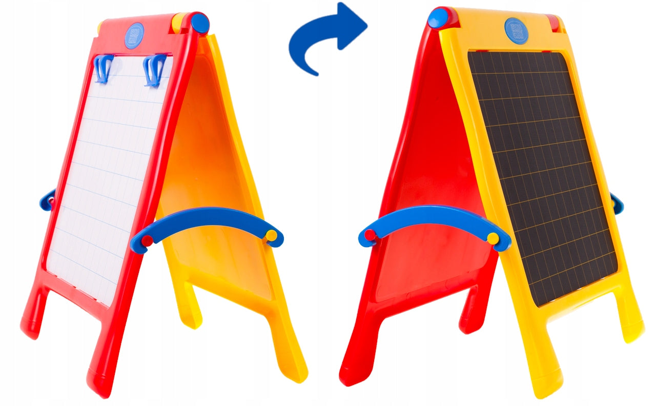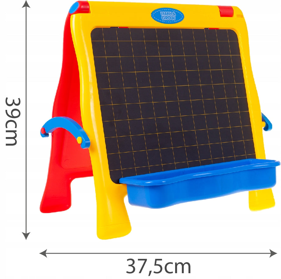 Ši universali lenta siūlo dvi skirtingas paviršių tipus, pritaikytus įvairioms kūrybinėms užduotims. Viena pusė – balta, idealiai tinkanti sausai valomiems žymekliams, su patogiais spaustukais lapams prisegti, kaip tikra miniatiūrinė dailės mokytojo lenta. Kita pusė – tamsi, skirta rašymui kreidelėmis, kuri taip pat yra magnetinė. Tai reiškia, kad ant jos galima ne tik piešti ir rašyti, bet ir tvirtinti magnetines raides, skaičius ar kitus edukacinius elementus, kurie yra komplekte. Stabilus stovas su spalvingais plastikiniais elementais užtikrina, kad lenta tvirtai stovėtų, o užapvalinti kraštai garantuoja saugų žaidimą.