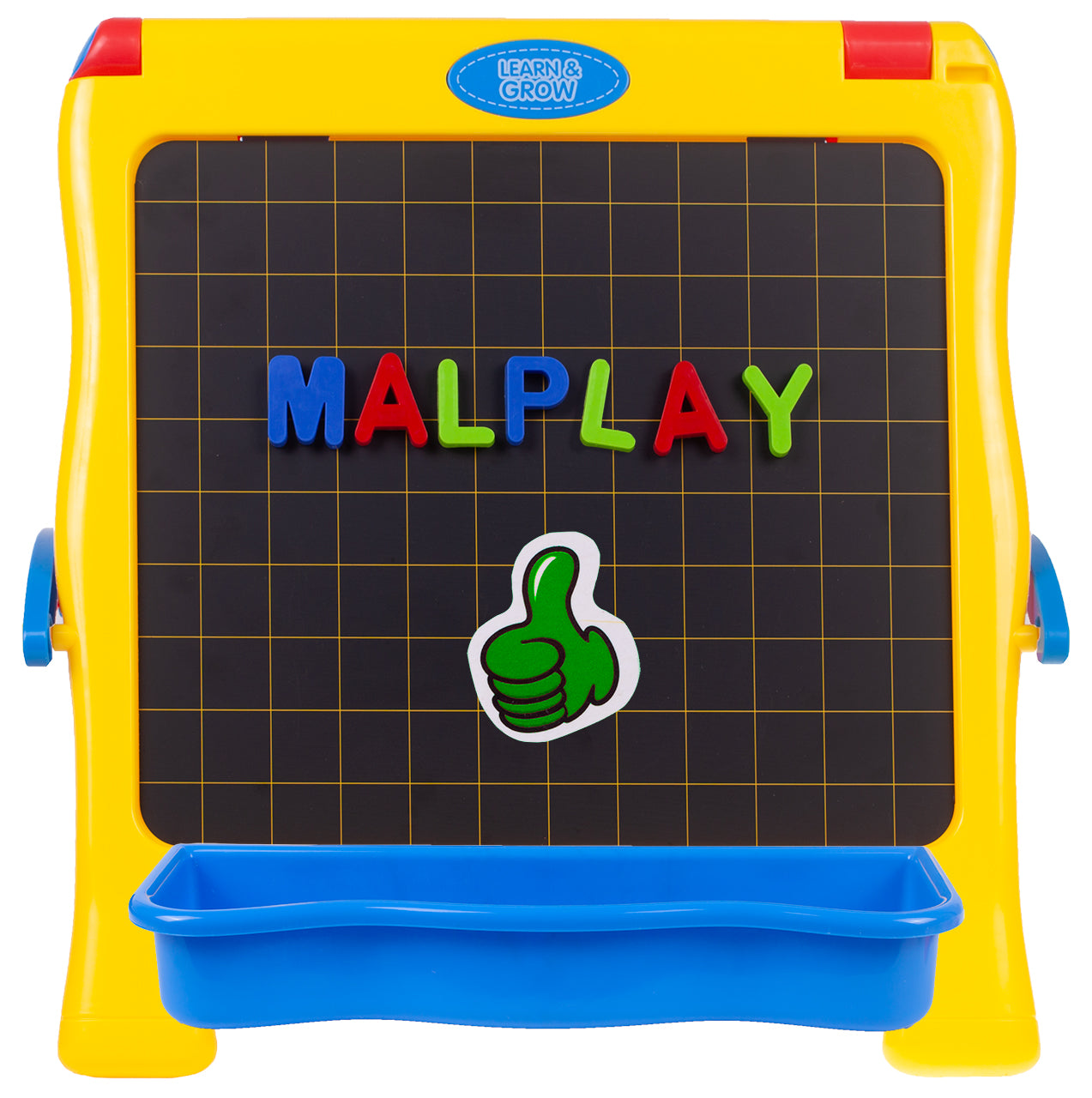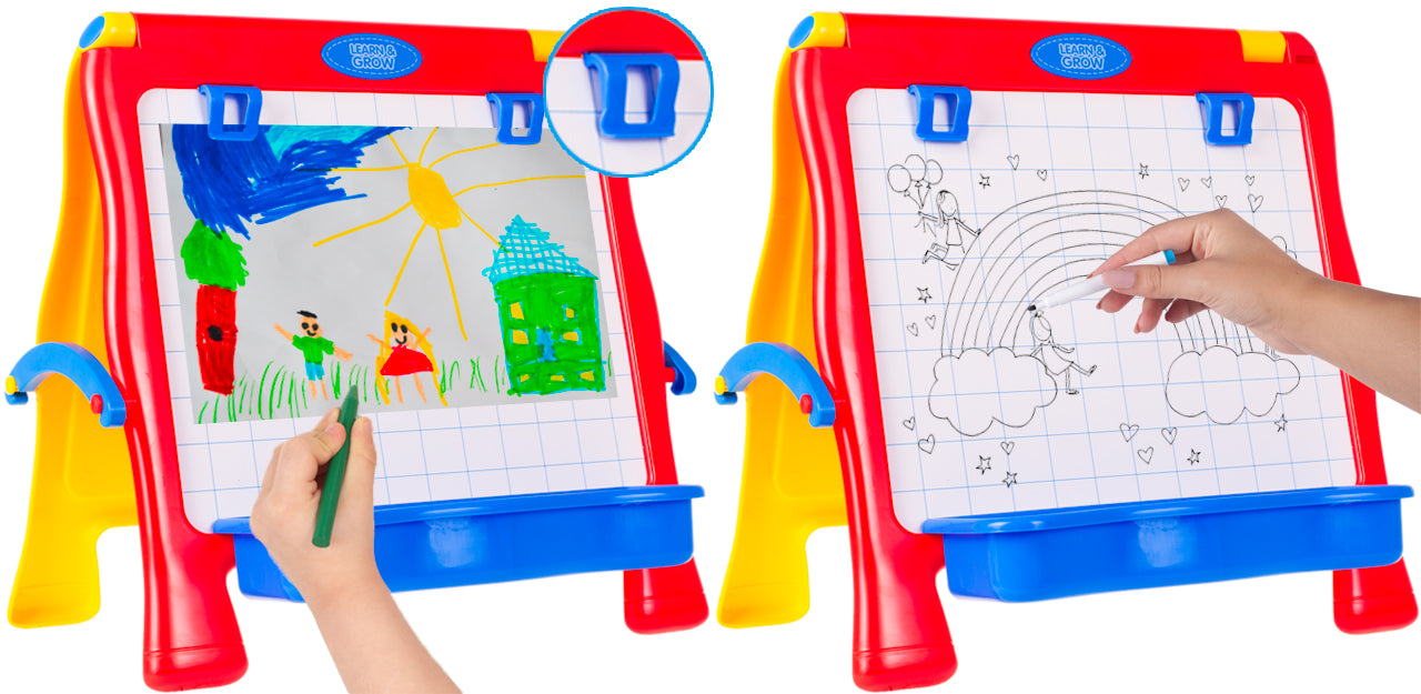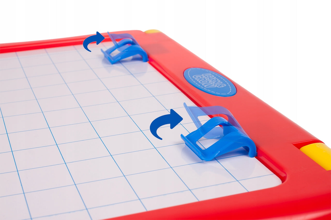 Ši universali lenta siūlo dvi skirtingas paviršių tipus, pritaikytus įvairioms kūrybinėms užduotims. Viena pusė – balta, idealiai tinkanti sausai valomiems žymekliams, su patogiais spaustukais lapams prisegti, kaip tikra miniatiūrinė dailės mokytojo lenta. Kita pusė – tamsi, skirta rašymui kreidelėmis, kuri taip pat yra magnetinė. Tai reiškia, kad ant jos galima ne tik piešti ir rašyti, bet ir tvirtinti magnetines raides, skaičius ar kitus edukacinius elementus, kurie yra komplekte. Stabilus stovas su spalvingais plastikiniais elementais užtikrina, kad lenta tvirtai stovėtų, o užapvalinti kraštai garantuoja saugų žaidimą.