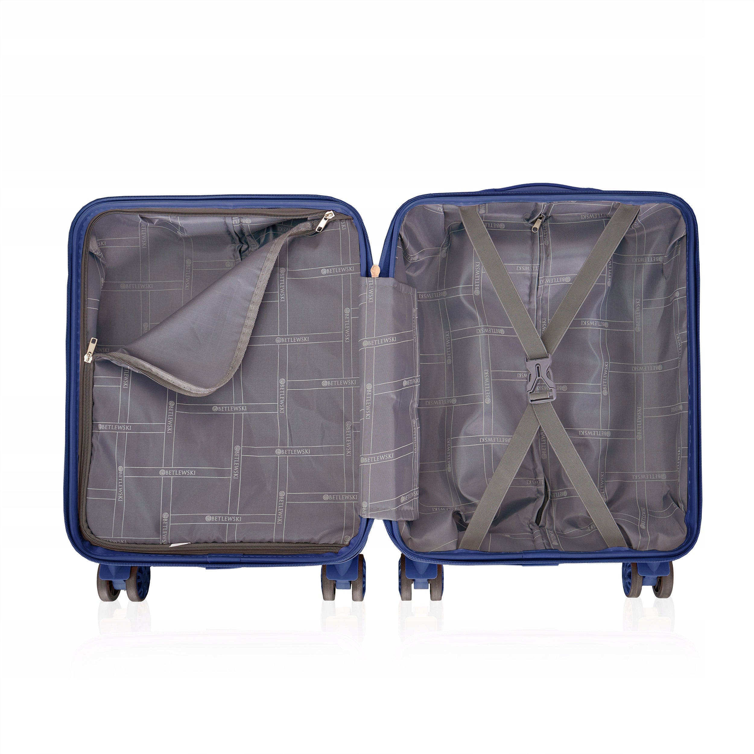 Kiekvienas lagamino elementas apgalvotas siekiant maksimalaus funkcionalumo ir jūsų patogumo. Atidarius lagaminą, jus pasitiks kruopščiai suplanuota erdvė. Vidus išklotas tvirtu, juodu poliesteriniu pamušalu su išsiuvinėtu Betlewski® logotipu. Pagrindinėje kameroje yra du skyriai, atskirti užtrauktuku užsegama pertvara, leidžiančia tvarkingai susidėti daiktus. Antroje pusėje yra elastingi diržai su sagtimis, kurie tvirtai prilaiko drabužius ir kitus daiktus, užkertant kelią jų išsibarstymui kelionės metu.