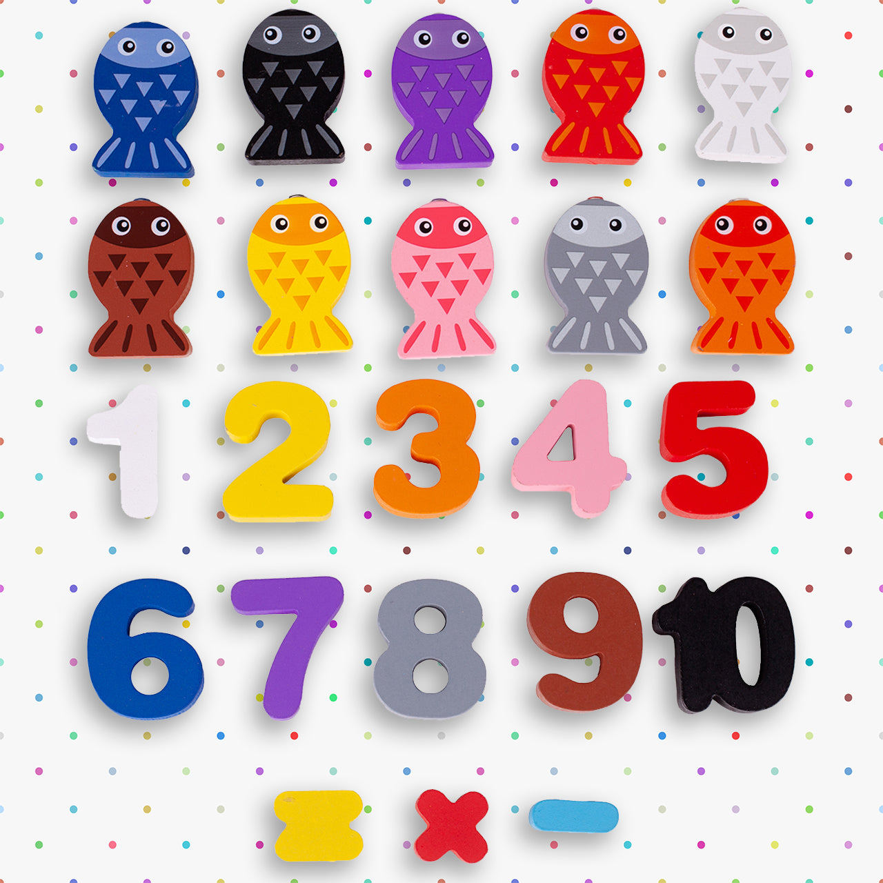 MEDINIS MONTESSORI ŽAIDIMAS-DĖLIONĖ: ŽUVYČIŲ GAUDYMAS, SKAIČIAI, FIGŪROS, TRANSPORTO PRIEMONĖS