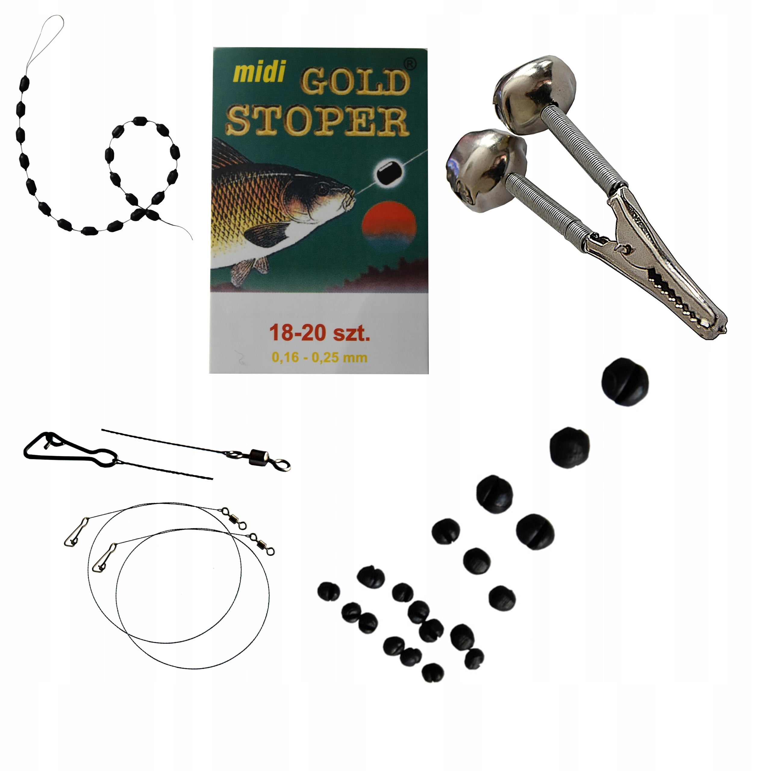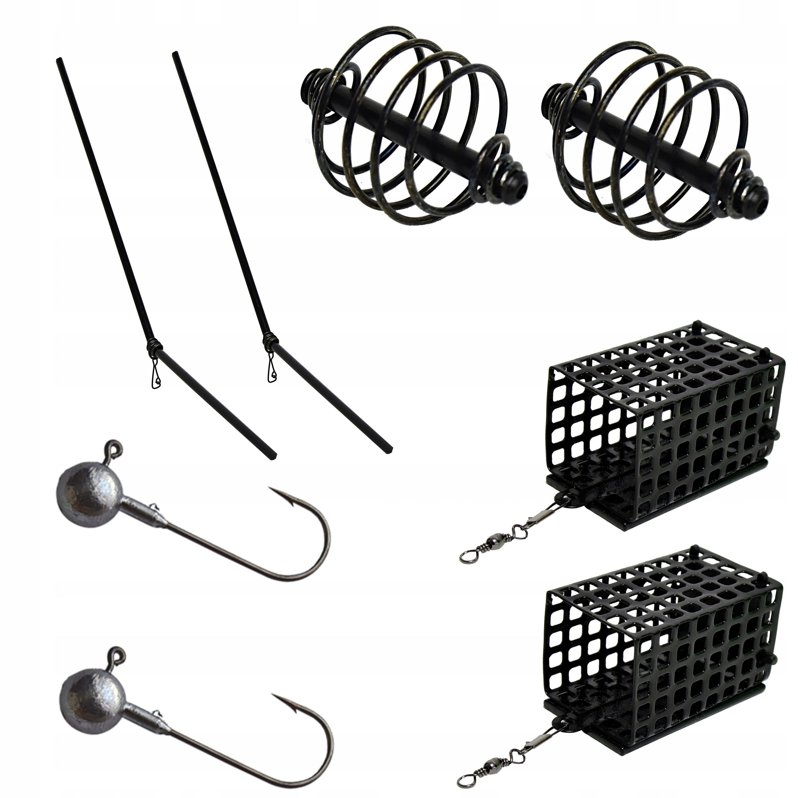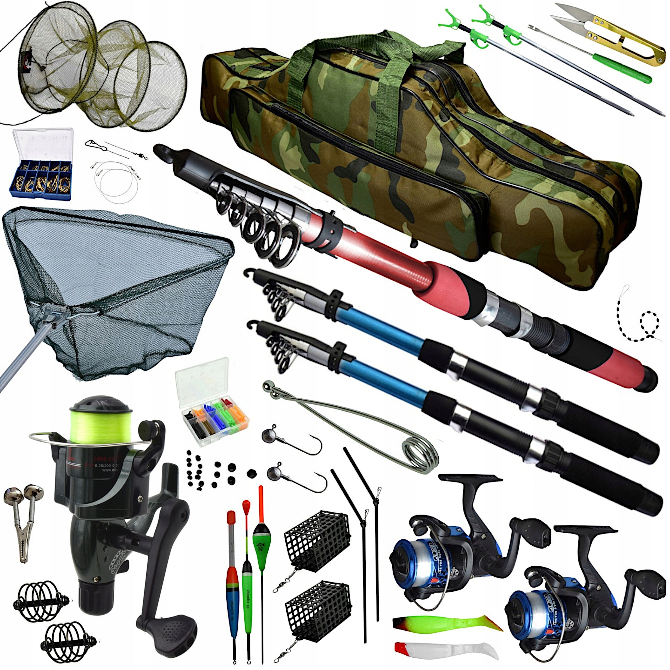 Šis „XXL“ rinkinys sukurtas taip, kad atitiktų visus jūsų žvejybos poreikius. Jame rasite viską nuo praktiško 180 cm teleskopinio graibšto, užtikrinančio saugų žuvies ištraukimą, iki 38x55 cm skersmens tinklo, skirto gyvoms žuvims laikyti vandenyje. Taip pat pridedami trys skirtingi spiningėliai, įvairaus svorio svareliai, guminės bei metalinės vėliavos, skirtos kibimo indikacijai, įvairių dydžių stoperiai ir daugybė kitų smulkių, bet svarbių aksesuarų, tokių kaip žūklės replės, kabliukų išvyniotuvai, sistemėlės ir vobleriai. Netgi patogus 80 cm dviejų skyrių meškerių dėklas su papildoma kišene leis viską tvarkingai susidėti ir transportuoti.