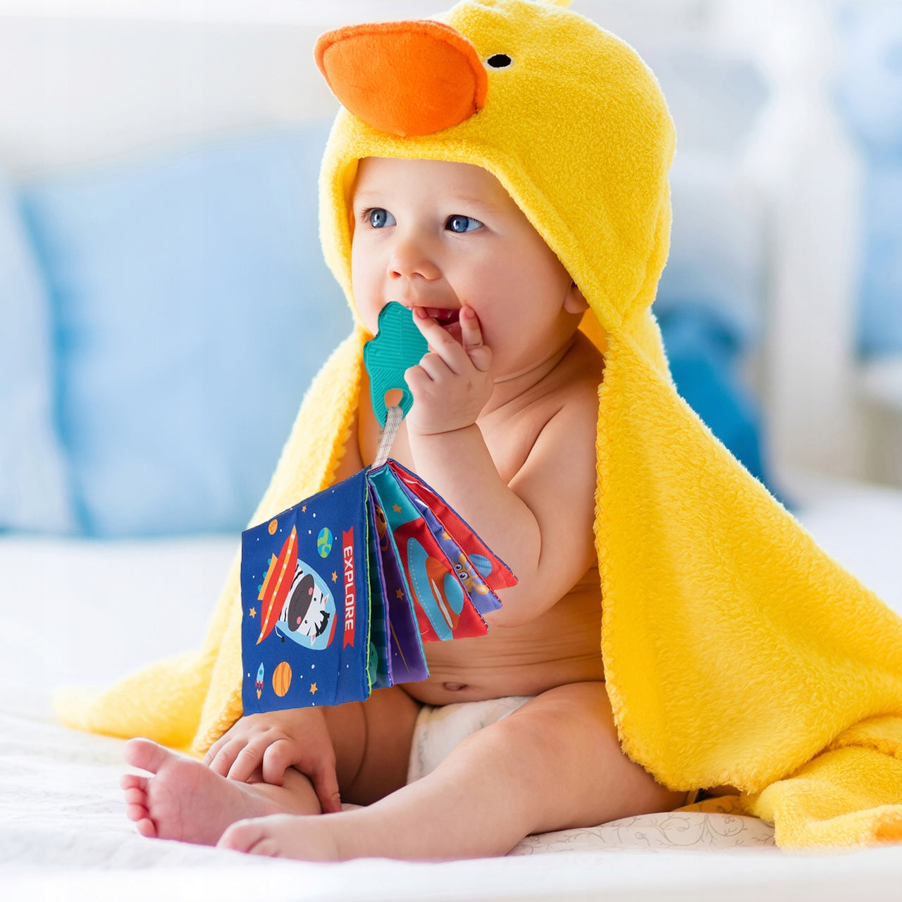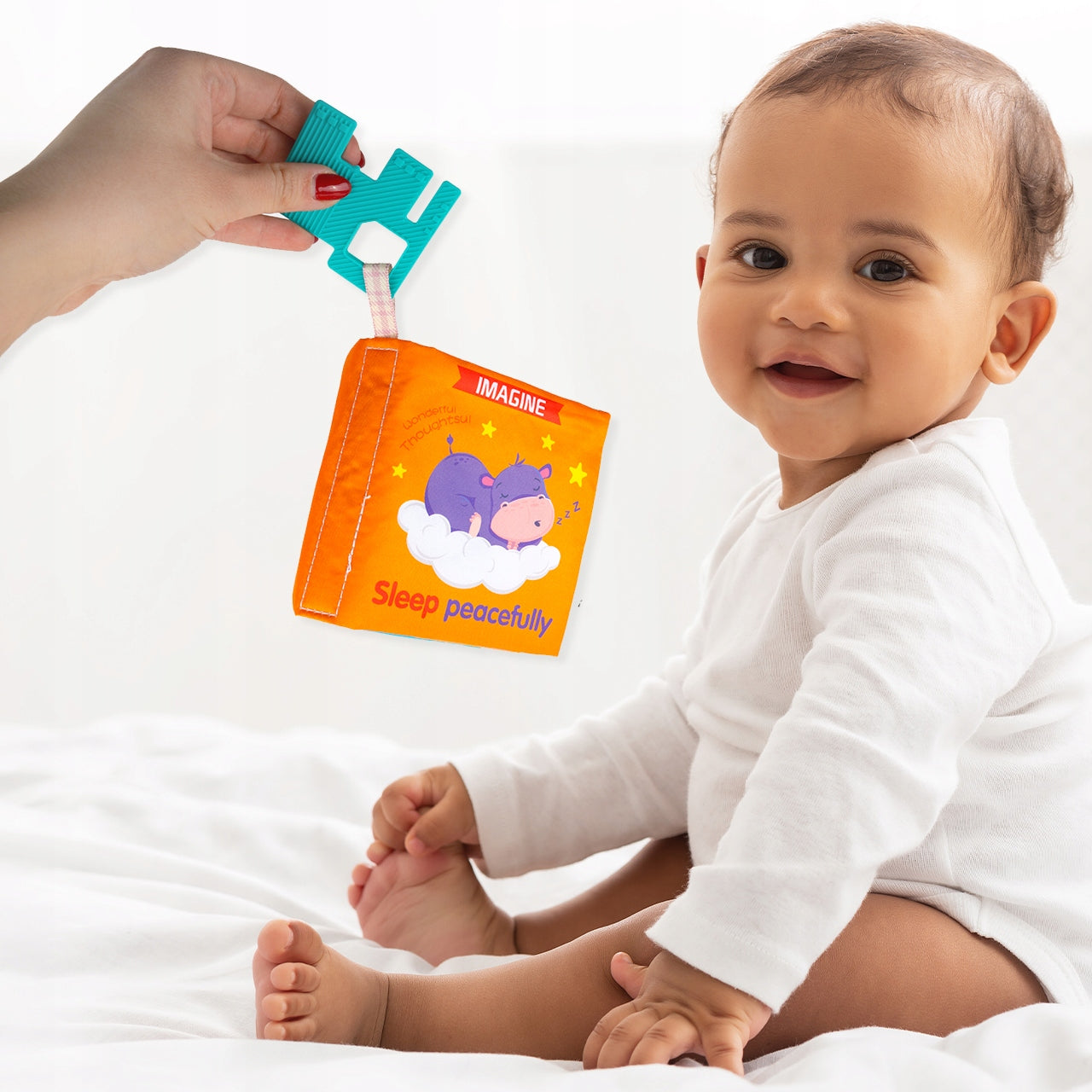 - Kiekvienai knygelei pritvirtintas saugus, minkštas kramtukas
