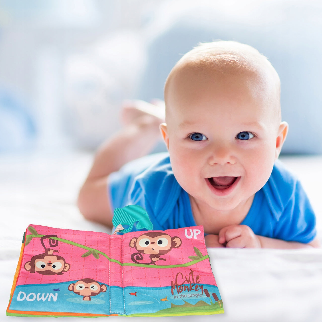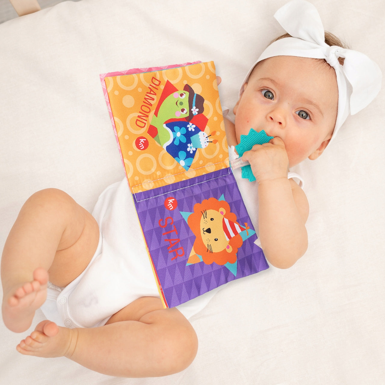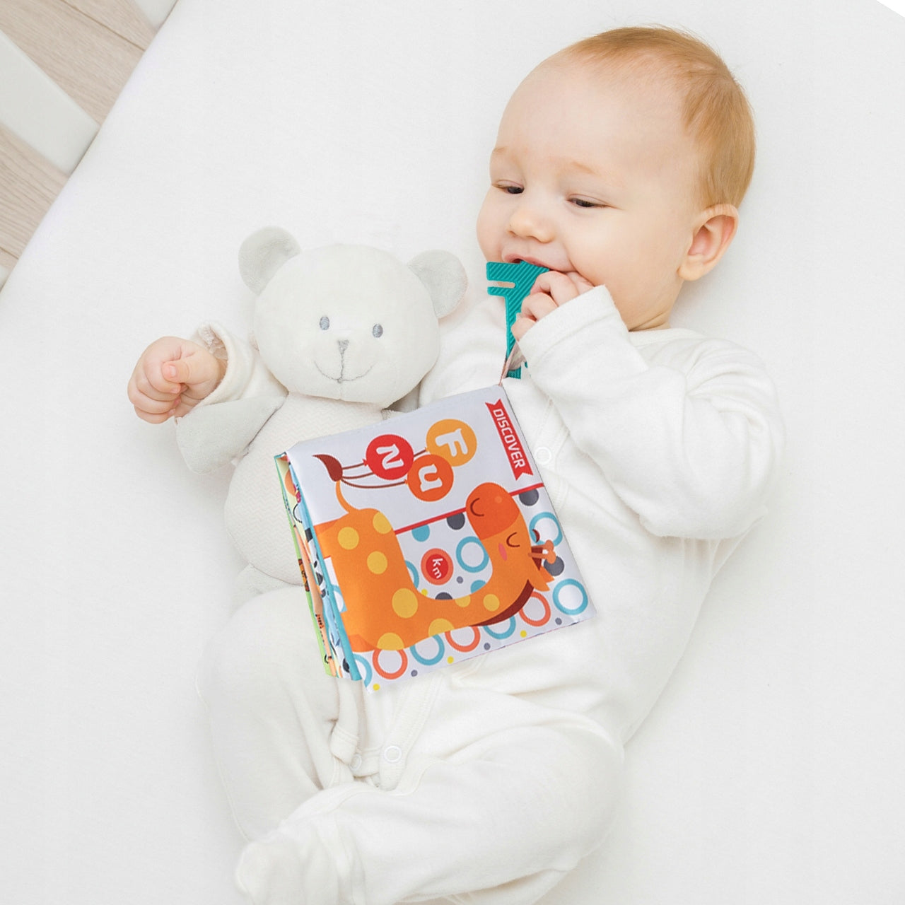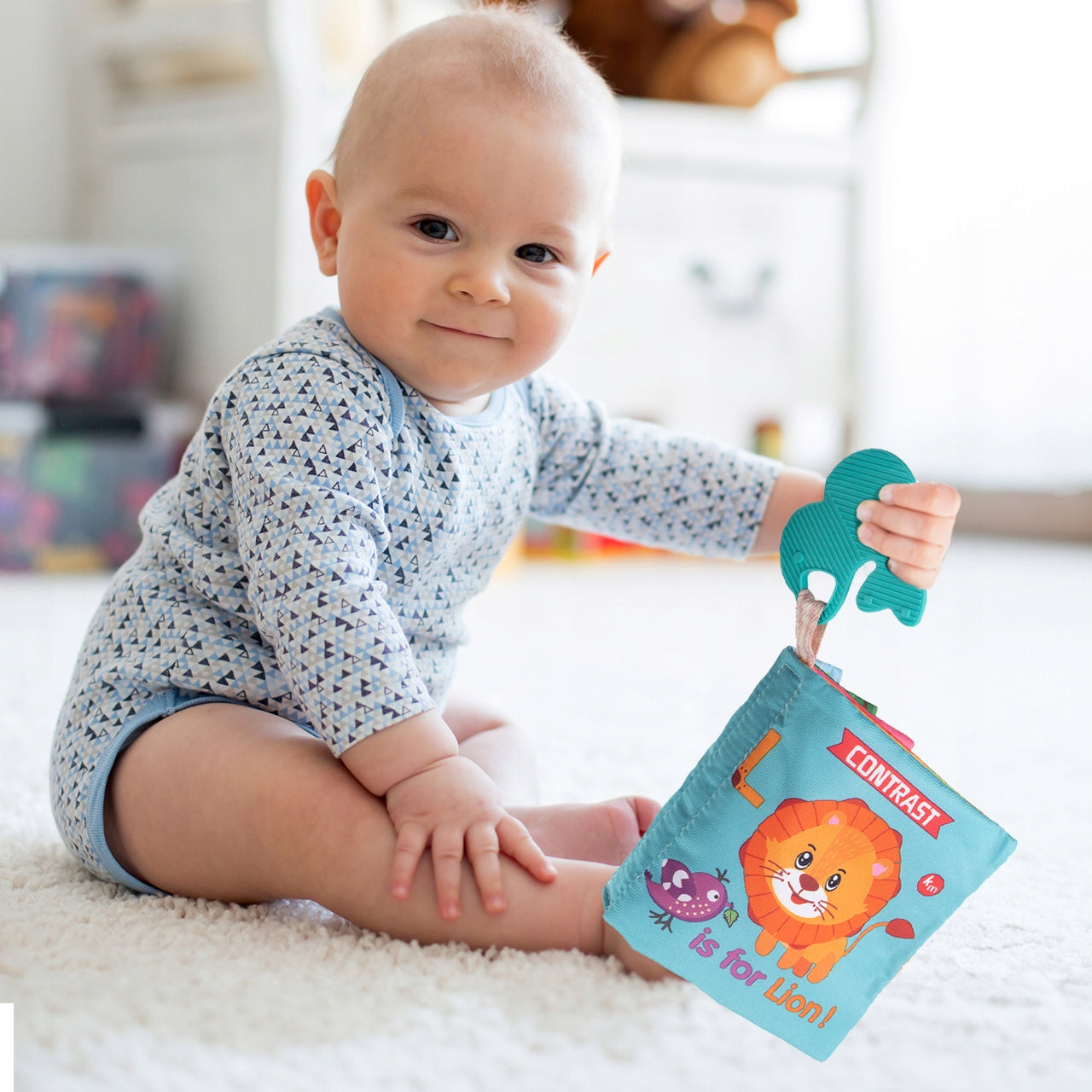 Šios spalvingos knygelės yra daugiau nei tik žaislas – tai edukacinis įrankis, skatinantis jūsų vaiko vystymąsi. Kiekvienoje knygelėje rasite 12 puslapių su ryškiomis, patraukliomis iliustracijomis gyvūnų temomis, kurios supažindins vaikus su anglų kalbos žodynu per gyvūnų pavadinimus ir jų veiksmus. Knygelės lapeliai šlama, o viduryje esanti švelni garsinė detalė (pvz., "pypsiukas") bei skirtingų faktūrų audiniai stimuliuoja klausos ir lytėjimo pojūčius. Minkštas, saugus plastiko kramtukas, pritvirtintas raišteliu, padeda nuraminti dantenas dygstant dantukams ir tuo pačiu gali tarnauti kaip patogi rankenėlė.