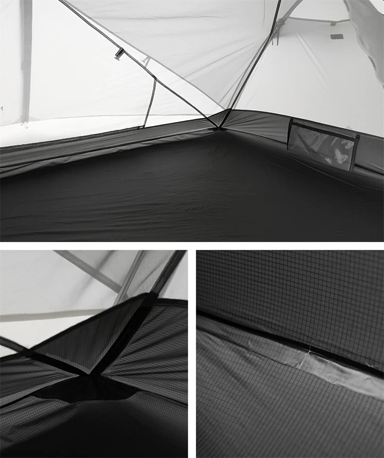 Mongar palapinė turi simetrišką ventiliacijos sistemą su oro srautu iš visų pusių – per priekinį įėjimą, galinę dalį ir šoninius langus, užtikrinant puikų oro cirkuliavimą ir mažinant kondensato susidarymą. 7001 aliuminio lydinio rėmas suteikia palapinei stabilumo net esant stipriam vėjui, o specialus kryžminis tvirtinimas sustiprina konstrukciją. Erdvus vidus (210 × 135 × 105 cm) patogiai talpina du žmones ir jų daiktus, o didelės priekinės durys leidžia patogiai įeiti ir išeiti iš palapinės.